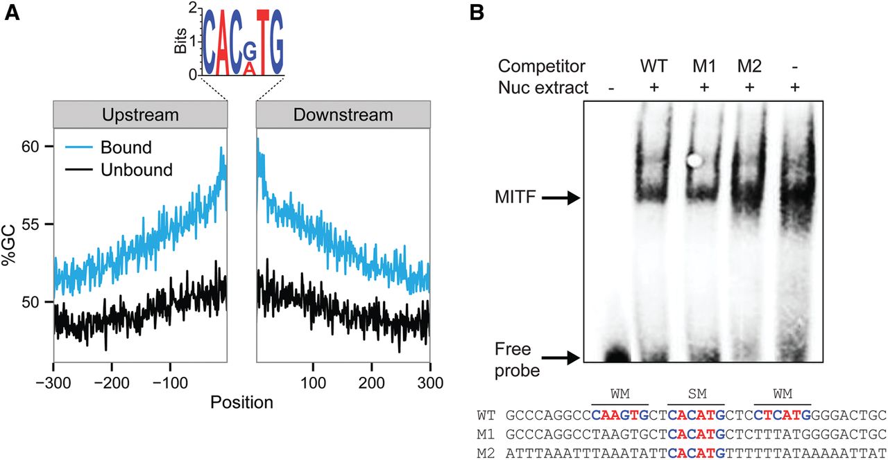 MITF binds to sequences showing overall high similarity to the E-box motif. (A) GC content (%GC) upstream of and downstream from motifs in sequences that are bound (blue) and unbound (black) by MITF. Logo of the MITF bound motifs are shown above: A and T bases are colored in red; G and C bases in blue. (B) EMSA competition assay with probe corresponding to the WT MITF binding region of the human TRPM1 promoter (WT), probe corresponding to the WT with interruption of the two weak MITF motifs (M1), and probe corresponding to the WT with replacement of all G/C by A/T base pair (M2). Highly expressing MITF melanoma cell (WM3682) nuclear extracts were used as a source of MITF (represented in the Nuc extract row above). A biotinylated WT probe was used for the analyses. WT or mutated unlabeled probes as described above were used in the competition analyses. MITF binding probes and free probes are marked with arrows. Probe sequences are shown below, where SM indicates strong motif and WM indicates weak motifs.
