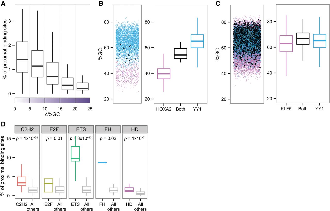 TF co-occupancy frequency. (A) Box plots representing the percentage of proximal binding sites relative to the differences in %GC of the motif environment. For each TF pair, the fraction in which one TF binding site occurs in close proximity to a binding site of another TF (y-axis) is plotted against the similarity or dissimilarity of the two TFs’ environmental preferences (x-axis). Close proximity is defined as 300 bp. (B, left) Jittered scatterplot showing GC content for each of the sequences bound by HOXA2 (pink), YY1 (blue), and both (black). (Right) Box plots representing the distribution of GC content for each of the sequences bound by HOXA2 (pink), YY1 (blue), and both (black). (C, left) Jittered scatterplot showing GC content for each of the sequences bound by KLF5 (pink), YY1 (blue), and both (black). (Right) Box plots representing the distribution of GC content for each of the sequences bound by KLF5 (pink), YY1 (blue), and both (black). (D) Box plots representing the percentage of proximal binding sites for each of the five TF families. The data were plotted separately for pairs of TFs from the same family and for pairs of TFs from different families. Wilcoxon test P-values indicate significant differences between the groups.