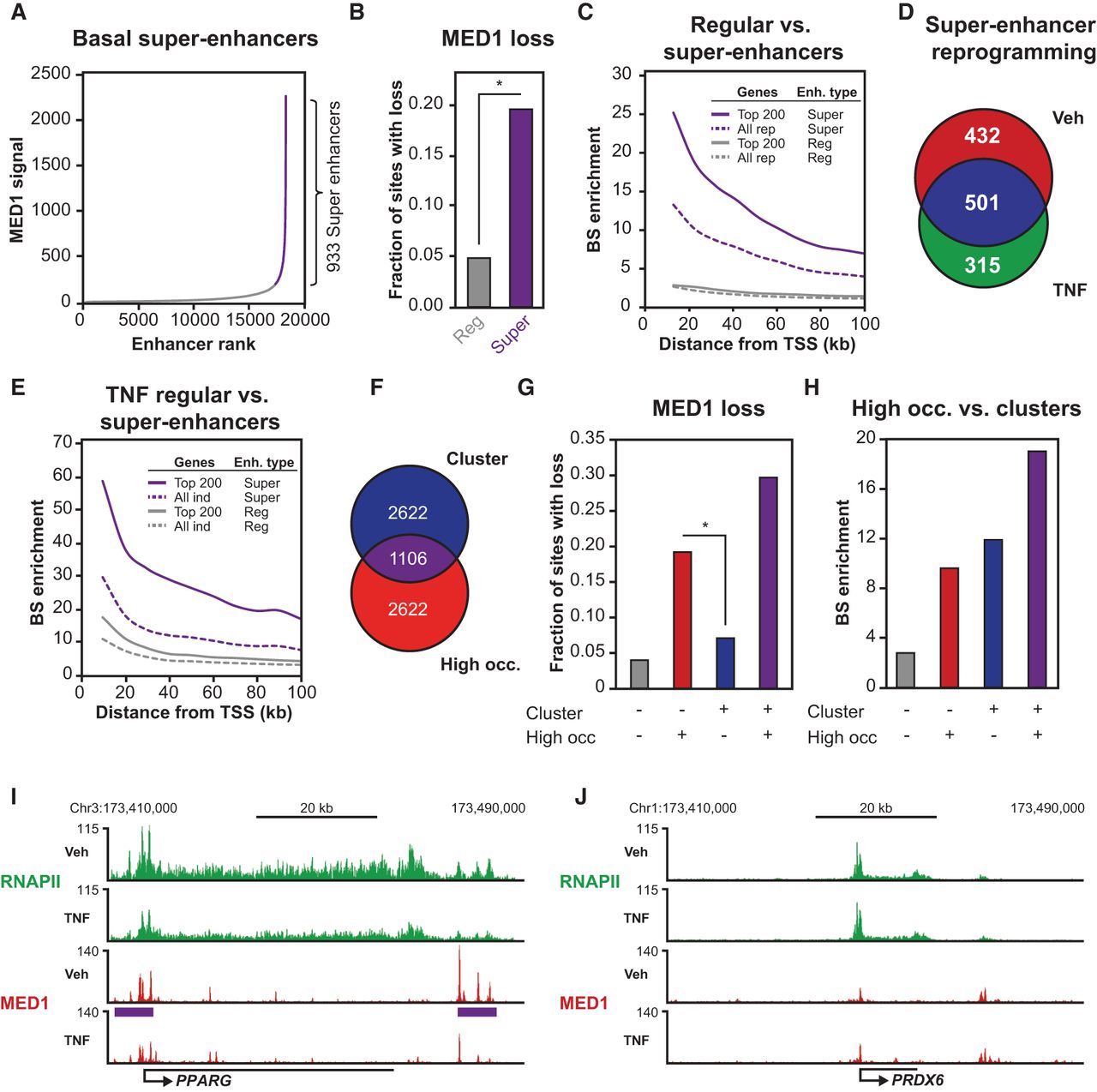 Adipocyte super-enhancers are sensitive to RELA-mediated MED1 redistribution. (A) Definition of basal super-enhancers. All identified MED1 (vehicle) binding sites (27,123) within 12.5 kb of each other were merged, resulting in 18,224 regions of which 933 were classified as super-enhancers in both MED1 replicates based on input-subtracted read counts. (B) Bar diagrams representing the fraction of basal regular and super-enhancer constituents with loss of MED1 in response to TNF exposure as defined in Figure 1D. P-value: * < 2.2 × 10−16, Pearson's χ2 test. (C) Enrichment of basal regular and super-enhancer constituents near TNF-repressed genes defined in Figure 1A. Enrichment was determined as the number of binding sites per gene within different distances from the TSS (10–100 kb) of repressed genes (top 200 and all repressed) relative to the number of binding sites per gene of constitutive genes. (D) Venn diagram representing the overlap between super-enhancers found in vehicle- and TNF-treated SGBS cells as defined in A and Supplemental Figure 4H, respectively. (E) Enrichment of TNF-activated enhancers (defined in Fig. 1D based on increase in MED1 occupancy) near TNF-induced genes defined in Figure 1A. TNF-activated enhancers are divided into two groups based on whether they overlap with a TNF-induced super-enhancer (defined in supplemental Fig. S4H) or not. (F) Venn diagram representing the overlap between enhancers defined as “cluster enhancers” based on their association with an enhancer cluster, or “high-occupancy enhancer” based on a high MED1 occupancy (defined in Supplemental Fig. S4K,L). (G) Bar diagrams representing the fraction of MED1 sites in the different groups defined in F that display loss of MED1 in response to TNF as defined in Figure 1D. P-value: * < 2.2 × 10−16, Pearson's χ2 test. (H) Enrichment of different types of MED1 sites defined in F near TNF-repressed genes defined in Figure 1A. Enrichment was determined as the number of binding sites per gene within 20 kb from the TSS relative to the number of binding sites per constitutive gene. (I,J) UCSC Genome Browser screenshots of RNAPII (green) and MED1 (red) occupancy at gene loci of a typical super-enhancer-associated gene repressed by TNF (PPARG) (I) and a regular enhancer-associated gene (PRDX6) not affected by TNF (J). The purple bars indicate the position of the super-enhancers.