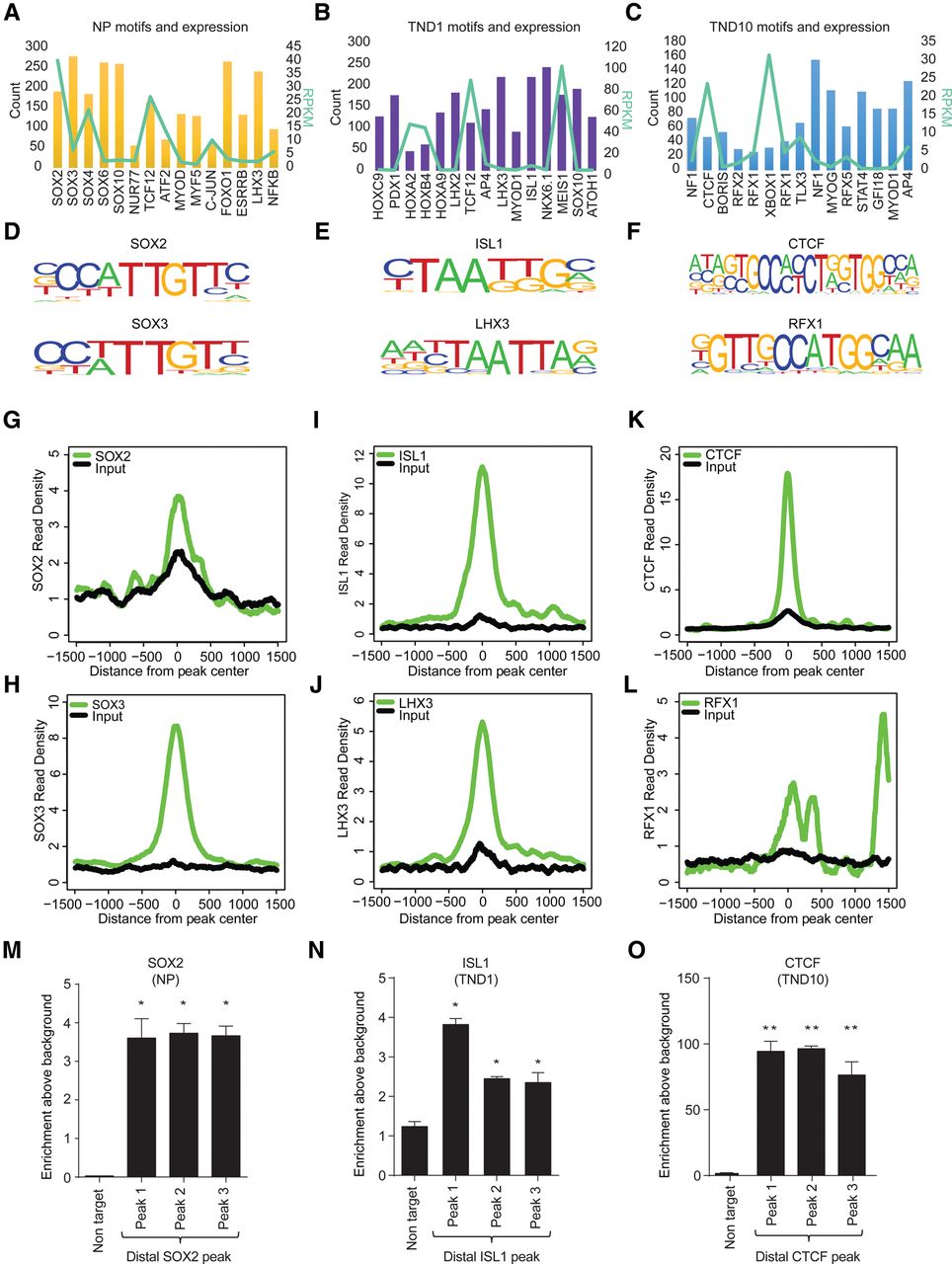 Distinct transcription factors are targeted to distal regulatory elements in a stage-specific manner during neurogenesis. (A–C) Bar and overlapping line plot showing identified motifs and their counts in NP, TND1, and TND10 at uniquely gained H3K27ac nonpromoter sites (bars, main y-axis) and their expression (line, alternate y-axis, light green). (D–F) Motif sequence of the selected transcription factors from the three stages. (G–L) Plots showing enrichment of the corresponding transcription factors around the center of the uniquely gained open H3K27ac peaks in NP (SOX2 and SOX3) (G,H), TND1 (LHX3 and ISL1) (I,J), and TND10 (CTCF and RFX1) (K,L). The x-axis shows the distance from the peak center; the y-axis represents normalized enrichment of the corresponding transcription factor. (M–O) ChIP-qPCR validation of selected distal regions for their occupancy using specific antibody, SOX2 in NP (M), ISL1 in TND1 (N), and CTCF in TND10 (O). Average enrichments from independent assays are plotted on the y-axis as a ratio of precipitated DNA (bound) to total input DNA and then further normalized to an intergenic region. Error bars represent the SEM of independent biological replicates. (*) P < 0.05; (**) P < 0.01, Student's t-test.