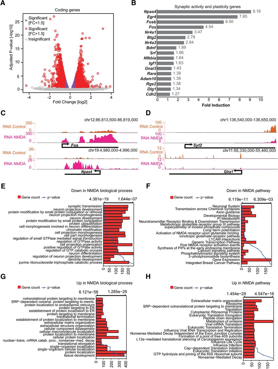 NMDA receptor signaling causes dramatic transcriptional changes. (A) Volcano plot showing up- and down-regulated genes upon NDMA treatment in TND10 neurons. The x-axis represents the fold change between control and NDMA in log2; the y-axis shows the adjusted P-value in −log10. (B) Bar plot showing fold induction of a few selected known synaptic activity and neuronal plasticity-related genes. The x-axis shows gain of expression fold change upon NMDA stimulation in neurons. (C,D) Browser tracks showing gain (C) and loss (D) of expression for key activity or neuronal-related genes. (E–H) Bar plots showing enrichment of biological processes and pathways in down-regulated (E,F) and up-regulated (G,H) genes upon NDMA stimulation. The bars reflect the number of genes in each category; the lines represent the multiple testing-corrected P-value, displayed as an alternate x-axis, of the corresponding GO term.