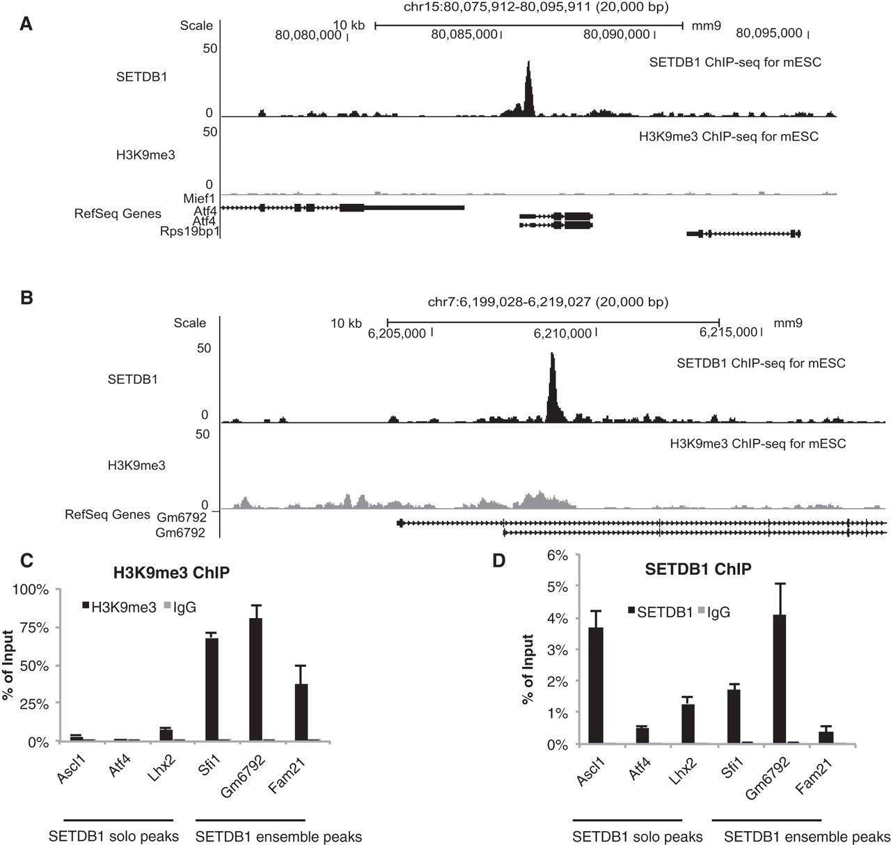 Classification of SETDB1 targets to solo and ensemble peaks. (A) Examples for SETDB1 solo (around Atf4 promoter) peaks. (Top) Track is the ChIP-seq profile of SETDB1 in wild-type mouse ES cells (Yuan et al. 2009). (Bottom) Track is the H3K9me3 ChIP-seq (biological replicate 1) signal in Setdb1 iKO cells (without Tam treatment). (B) Examples for SETDB1 ensemble (around Gm6792 promoter) peaks. (Top) Track is the ChIP-seq profile of SETDB1 in wild-type mouse ES cells (Yuan et al. 2009). (Bottom) Track is the H3K9me3 ChIP-seq (biological replicate 1) signal in Setdb1 iKO cells (without Tam treatment). (C) ChIP-qPCR of H3K9me3 in selected SETDB1 peak loci. Setdb1 iKO mouse ES cells underwent ChIP with H3K9me3 antibody. Anti-rabbit normal IgG was used as a negative control. The enrichment level was normalized to input. The selected SETDB1 peak loci were marked by their nearby gene symbols (Atf4, Lhx2, Ascl1 for SETDB1 solo peaks; Fam21, Gm6792, Sfi1 for SETDB1 ensemble peaks). (D) ChIP-qPCR of SETDB1 in selected SETDB1 peak loci. Setdb1 iKO mouse ES cells underwent ChIP with SETDB1 antibody. Anti-rabbit normal IgG was used as a negative control. The enrichment level was normalized to input. The selected SETDB1 peak loci were marked by their nearby gene symbols (Atf4, Lhx2, Ascl1 for SETDB1 solo peaks; Fam21, Gm6792, Sfi1 for SETDB1 ensemble peaks).