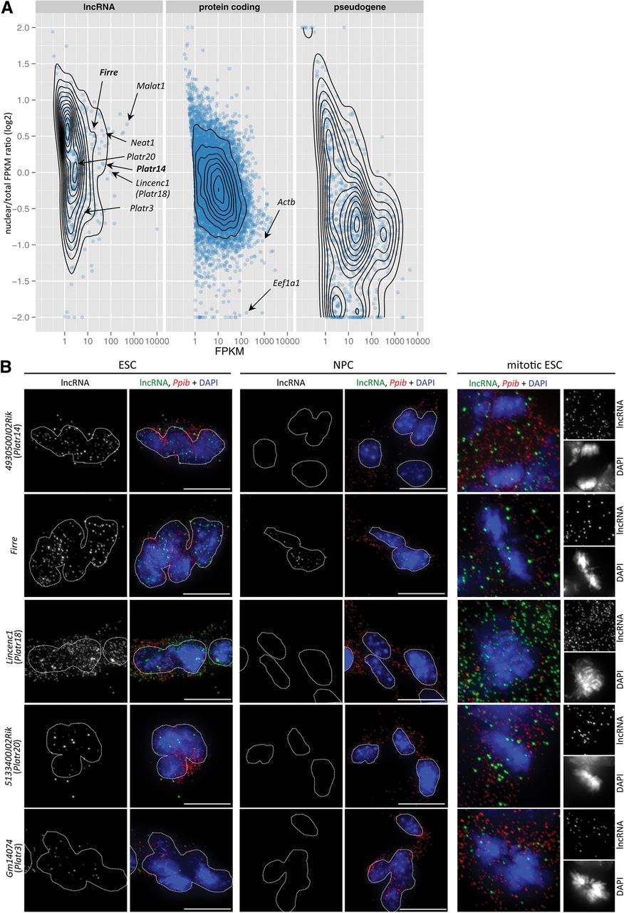 Identification of nuclear-enriched lncRNAs. (A) Nuclear to total log2 FPKM ratio by annotated gene biotype (Ensembl v.76) in AB2.2 ESCs plotted against FPKM values obtained from total cell RNA-seq. Only genes with expression >1 FPKM in either nuclear or total fraction are plotted. (B) Single-molecule RNA FISH in AB2.2 ESCs and NPCs using probe pairs specific for Platr14, Firre, and other indicated lncRNAs (green). Housekeeping Ppib mRNA (red) is used as a control. Images represent maximum intensity projections. Dotted lines demarcate the nuclear outline of individual cells or ESC colonies. (Scale bar) 10 µm. Mitotic images are enlarged twofold.