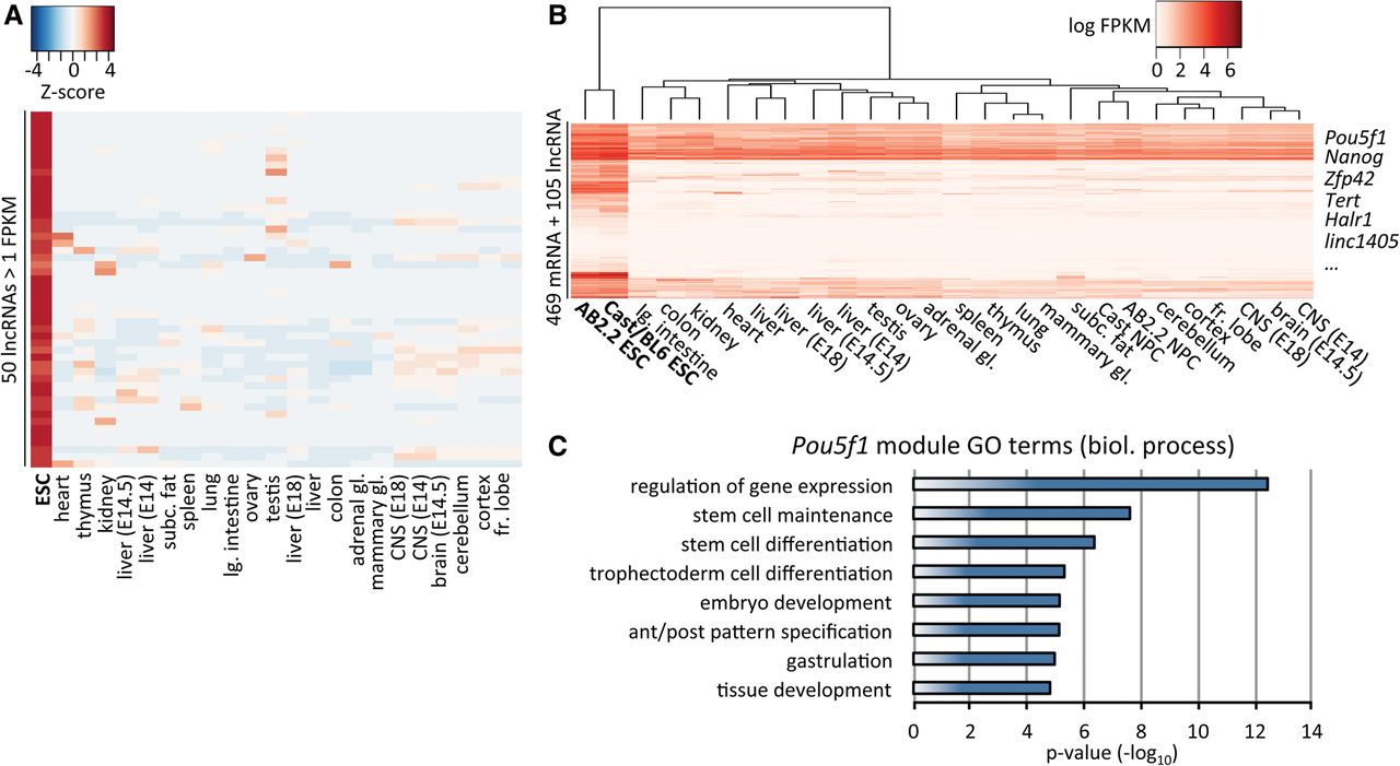 Identification of ESC-associated lncRNAs. (A) Heatmap (GeneWise Z-score) of the 50 lncRNAs most specifically (calculated based on Z-score) expressed in ESCs at ≥1 FPKM. ENCODE mouse tissue poly(A)+ RNA-seq data represent the average expression of two biological replicates. (B) Expression heatmap of the gene module containing Pou5f1 as determined by weighted gene coexpression analysis. (C) Gene ontology (GO) terms for biological process selected from the top 20 nonredundant terms enriched in the Pou5f1 gene module. Enrichment was ranked based on Fisher's exact test.