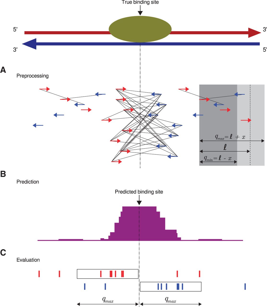Q workflow. (A) A preprocessing step identifies “qfrags” as pairs of reads on opposite strands located within ℓ±x nucleotides from one another. In regions of true signal, this has the effect of approximately quadratically amplifying the signal, whence the name of the algorithm. The qfrags are shown as black lines connecting the 5′ ends of compatible reads. For instance, the red (forward strand) read at the left edge of the gray box can form a qfrag with any blue (reverse strand) read that is located in the light gray portion of the box (≥qmin and ≤qmax nucleotides). qfrags are symbolized by black lines between 5′ ends of red and blue reads. (B) The qfrag depth is calculated for each position along the genome. Candidate regions for hypothesis testing are identified as local qfrag height maxima (summits, or predicted binding sites). (C) Candidate regions are defined as the regions comprising the qmax nucleotides upstream of and downstream from the predicted binding site, and statistical testing is performed on each candidate peak based on the saturation analysis in a window defined by 2 · qmax.