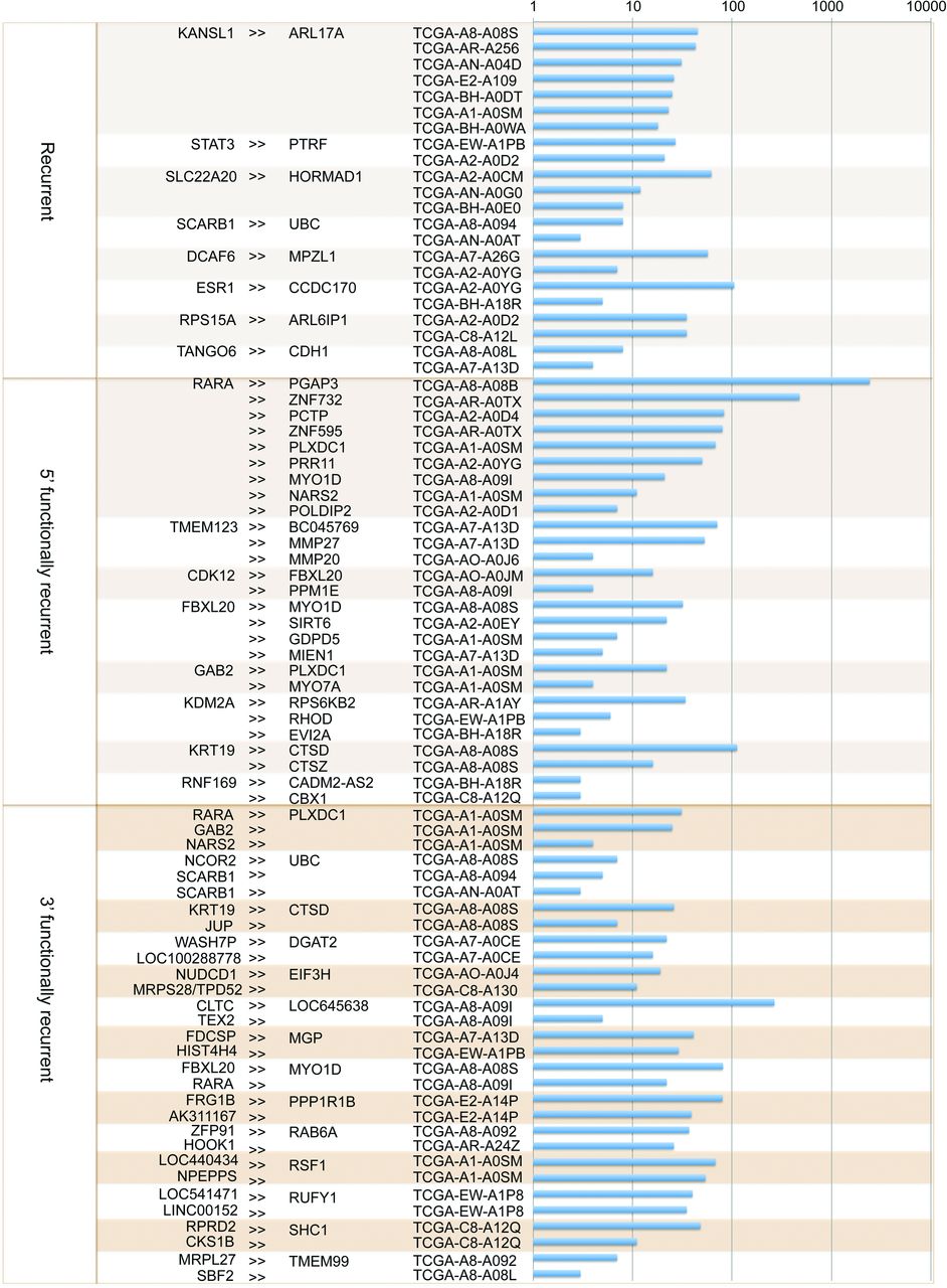 Recurrent and functionally recurrent gene fusions in a TCGA 62 breast cancer patient cohort. Gene fusions are listed in the order of recurrent, 5′ functionally recurrent, and 3′ functionally recurrent. The first column shows the 5′ genes and the second column shows the 3′ genes. The third column is the TCGA names of the samples. Bar chart in the fourth column shows the log scale value of the quantity of supporting RNA-seq reads for each gene fusion.