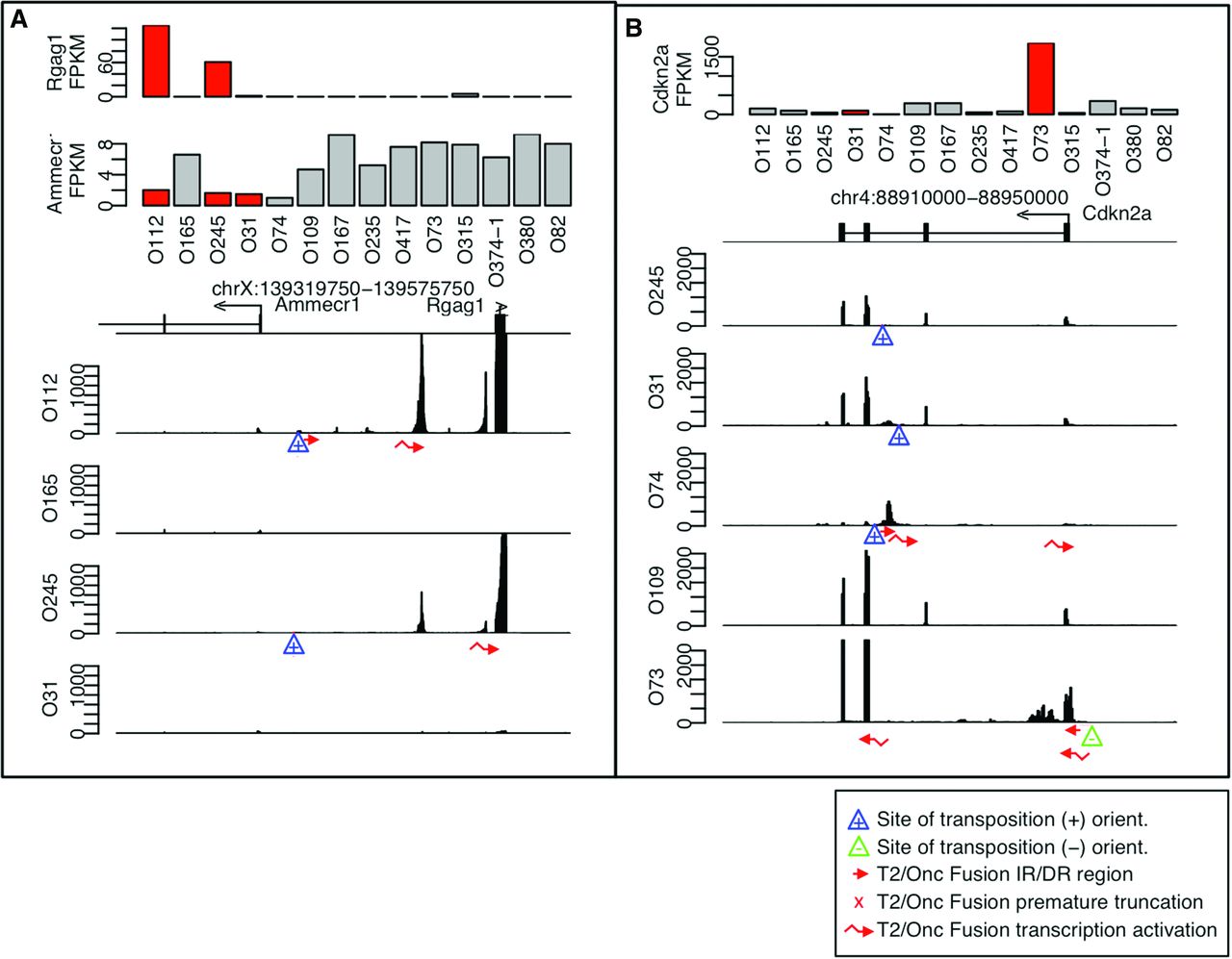Precise identification of CIS transposon targeting. Histograms, similar to Figure 1, allow precise identification of the molecular mechanism of insertion in CIS near (A) Ammecr1 and Rgag1, and (B) Cdkn2a. Locations of LM-PCR junction fragments and fusion products are shown as described for Figure 1.