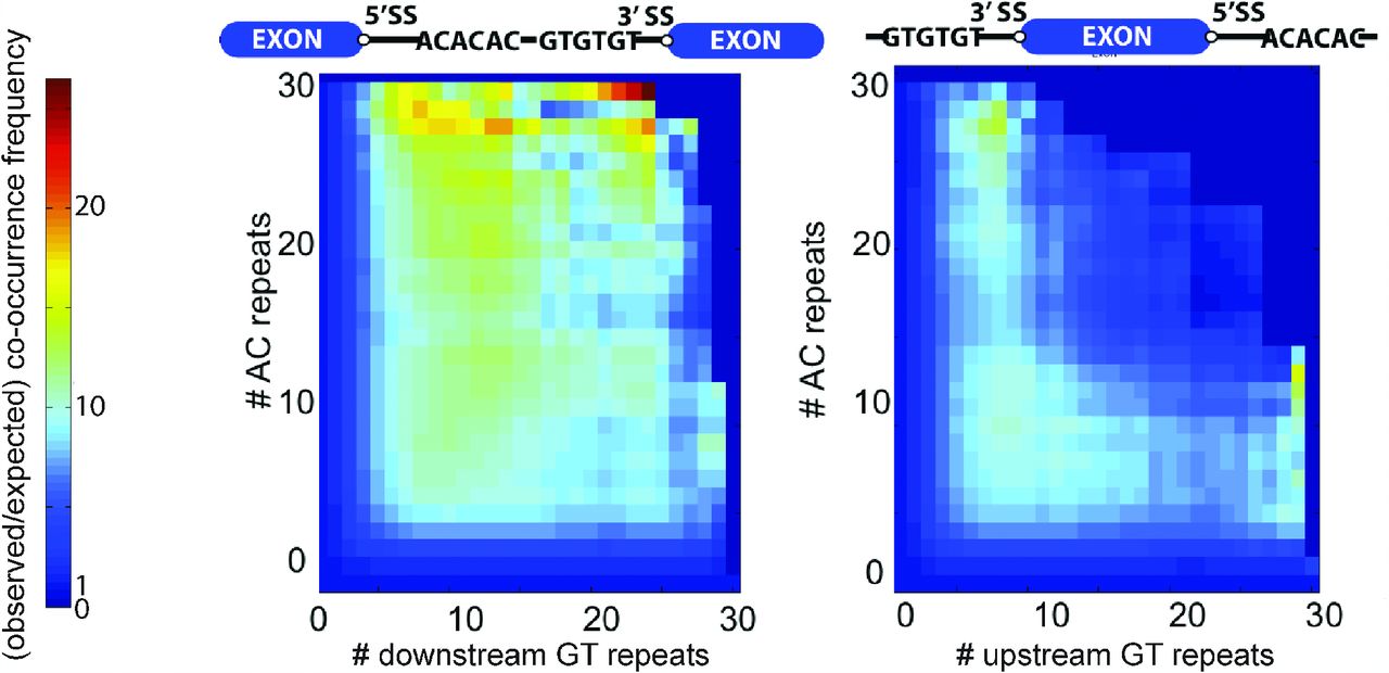 AC and GT repeats co-occur across introns, not exons. Zebrafish introns containing AC repeats within 200 nt of the 5′ ss were examined for downstream intron GT repeats (left panel) or upstream intron repeats (right panel). Introns were binned according to the length of the GT repeats (# of repeats, x-axis) and AC repeats (# of repeats, y-axis). The observed frequency of introns with each combination of repeat length is shown on the graph. The heat map color of each bin indicates the fold difference of observed frequency over the co-occurrence frequency predicted by a model of independently distributed AC and GT repeats.