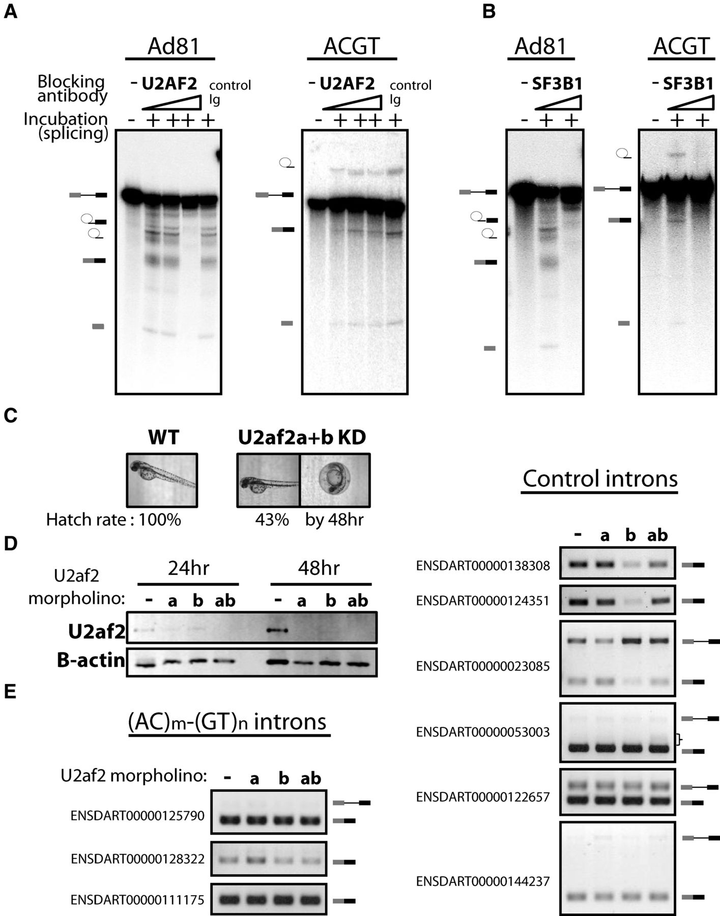 The splicing of (AC)m-(GT)n introns requires components of U2 snRNP but not U2AF2. In vitro splicing substrates were prepared from the constructs used in Figure 4 and the model in vitro splicing construct Ad81. The in vitro–transcribed RNA was incubated in HeLa nuclear extract for the splicing assay. (A) The splicing of the Ad81 control was compared to the (AC)m-(GT)n intron with pre-incubation with either: no antibody, a control antibody, or increasing amounts of anti-U2AF2 antibody. The input pre-mRNA and the splicing products, including the lariat intermediate and free first exon from the first step of splicing, the free lariat, and ligated exon from the second step of splicing, were resolved on an 8M urea gel and visualized by autoradiography with a phosphoimager. (B) The comparison described above was repeated with antibody targeting SF3B1, a component of the U2 snRNP. (C) u2af2 knockdown (KD) in zebrafish embryos. The KD embryos developed without gross phenotypic defect by 48 h but with lower hatch rate. (D) Western blotting of U2af2 24 or 48 h after injection. Beta actin served as a loading control. (E) RT-PCR of single intron transcripts containing (AC)m-(GT)n repeats (left) or without the repeats (right). Pre-mRNA and/or spliced mRNA is depicted on the right of the gel images. A bracket indicates the smear of the PCR product, possibly due to the loss of splicing accuracy.