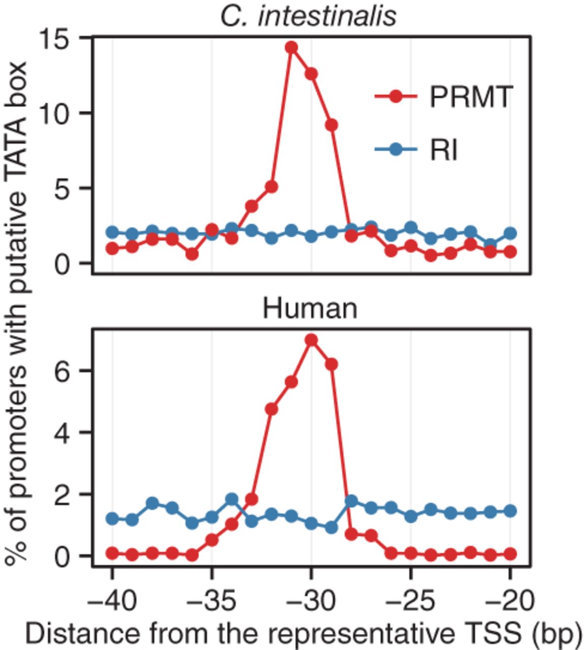 Distribution of TATA boxes. The positions of putative TATA boxes were examined in core promoter regions. The x- and y-axes represent the distance from the representative TSS and the percentage of promoters with the putative TATA box at a given position, respectively. In addition to promoter sequences, the positions of putative TATA boxes in random intergenic regions are also shown (blue line). Intergenic regions (3000 and 6000) were randomly extracted from the C. intestinalis and human reference genomes, respectively. (PRMT) Promoter regions, (RI) random intergenic regions.