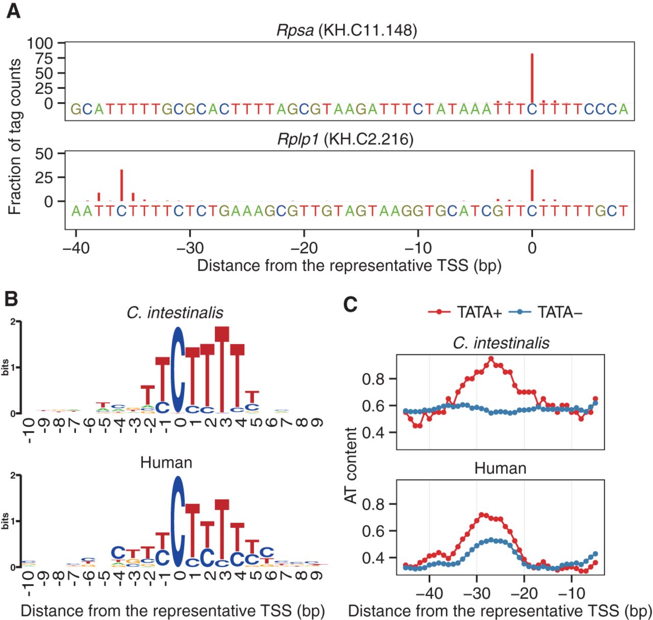 Characterization of ribosomal protein (RP) gene promoters. (A) TSS distributions and polypyrimidine tracts of RP gene promoters. The TSS distributions of the Rpsa and Rplp1 promoters are shown as examples. The nucleotides at the corresponding positions, including polypyrimidine tracts, are also shown. (B) Polypyrimidine initiator of RP gene promoters. The sequences from −10 to +9 of the 79 RP gene promoters were aligned relative to the representative TSS. The TSSs reported by Perry (2005) were used as the representative TSSs of human RP gene promoters. (C) Distribution of the A+T content of RP gene promoters. The A+T content was calculated by using a 10-bp sliding window. TATA+ and TATA− represent TATA-containing and TATA-less RP gene promoters, respectively.