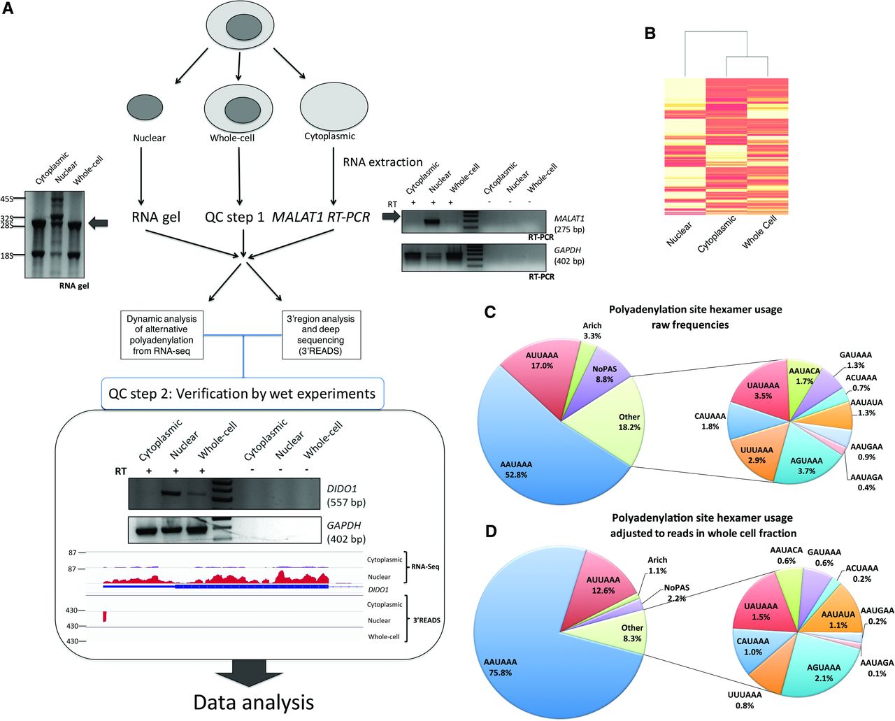 Subcellular fractionation-based APA analysis. (A) Schematic of the experimental approach showing the workflow and quality control steps. (Left) RNA gel and the enrichment of the precursor ribosomal RNAs in the nuclear fraction. (Right) RT-PCR of the nuclear marker MALAT1 and the GAPDH loading control. (Lower) Verification of the deep-sequencing step, confirming the subcellular distribution of DIDO1 as measured by 3′READS and RNA sequencing. (B) Heatmap and dendrogram plot showing similarity between subcellular fractions. (C) Polyadenylation signal (PAS) frequencies in the 0- to −40-nt region of all mapped cleavage and polyadenylation (CPA) sites. Here, only frequencies are taken into account, with all CPA sites considered equal, regardless of read number. (D) Read number–adjusted PAS frequencies, as in C, but with numbers reflecting reads over respective PAS in the whole-cell fraction of HEK293 cells.