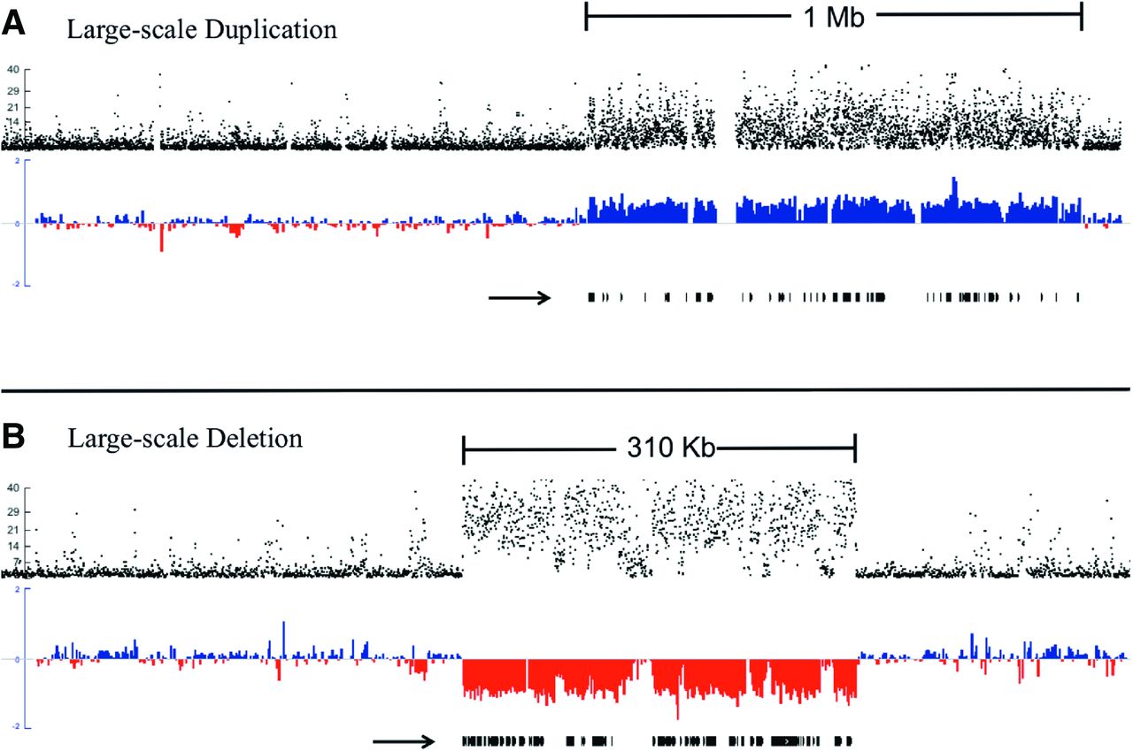 Large-scale duplication and deletion. (A) Large-scale duplication; (B) large-scale deletion. Black dots (top track on each figure) represent −log10P for each consecutive sliding window on scaffold 8 (A) and scaffold 17 (B) from the D. pulex reference assembly, where P denotes the probability the depth of sequencing coverage deviates from 1:1 by chance between the MA subline where the de novo CNV occurred and other sublines (see Methods). On the middle track in A (blue, duplication) and B (red, deletion), the normalized, log2 coverage ratio of the subline where the de novo CNV mutation versus a composite of the other three subline comparisons is plotted for both scaffolds in 500-bp windows, with sliding 250-bp increments (see Methods). The black arrow below the normalized coverage tracts denotes all D. pulex full-gene models nested within each duplication and deletion. Note that the separate scaffolds of these two events are not the same length, so the deletion (310 kb) and duplication (1 Mb) are not to scale. Large-scale CNVs were subsequently validated by RT-qPCR.