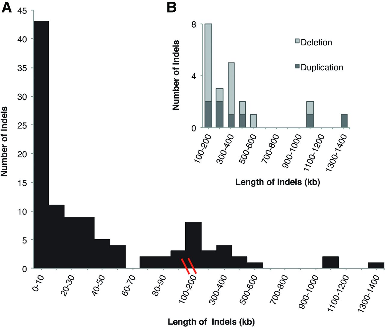 Size spectrum of de novo duplications and deletions (indels) >3000 bp. (A) All indel sizes for both the ASEX and CYC experiments >3 kb; (B) only large-scale de novo indels >100 kb, split into duplications and deletions.