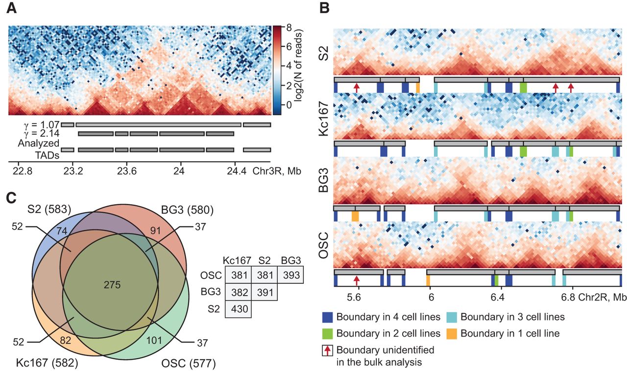 Genomic positions of topologically associating domains (TADs) are largely conserved among Drosophila cells of different origins. (A) A fragment of the Hi-C interaction map (heat map) for the BG3 cell line. Gray rectangles below the heat map represent TADs predicted with two different values of the scaling parameter γ. This illustrates a two-step TAD prediction method utilizing a higher γ value for large TADs containing internal self-interacting domains. (B) Heat maps of a 1.6-Mb region of Chromosome 2R with annotated TADs. Positions of boundary bins are indicated by colored rectangles under the TADs map. The color code for the boundary bins is shown at the bottom. Red arrows indicate unidentified weak boundaries. The resolution of all heat maps is 20 kb. (C) Venn diagram showing the numbers of TADs shared between all studied cell lines (with both boundaries located at the same genomic bin or at adjacent bins). Total numbers of TADs in each cell line are shown in parentheses. Numbers of TADs shared between different pairs of the cell lines are shown to the right of the diagram.