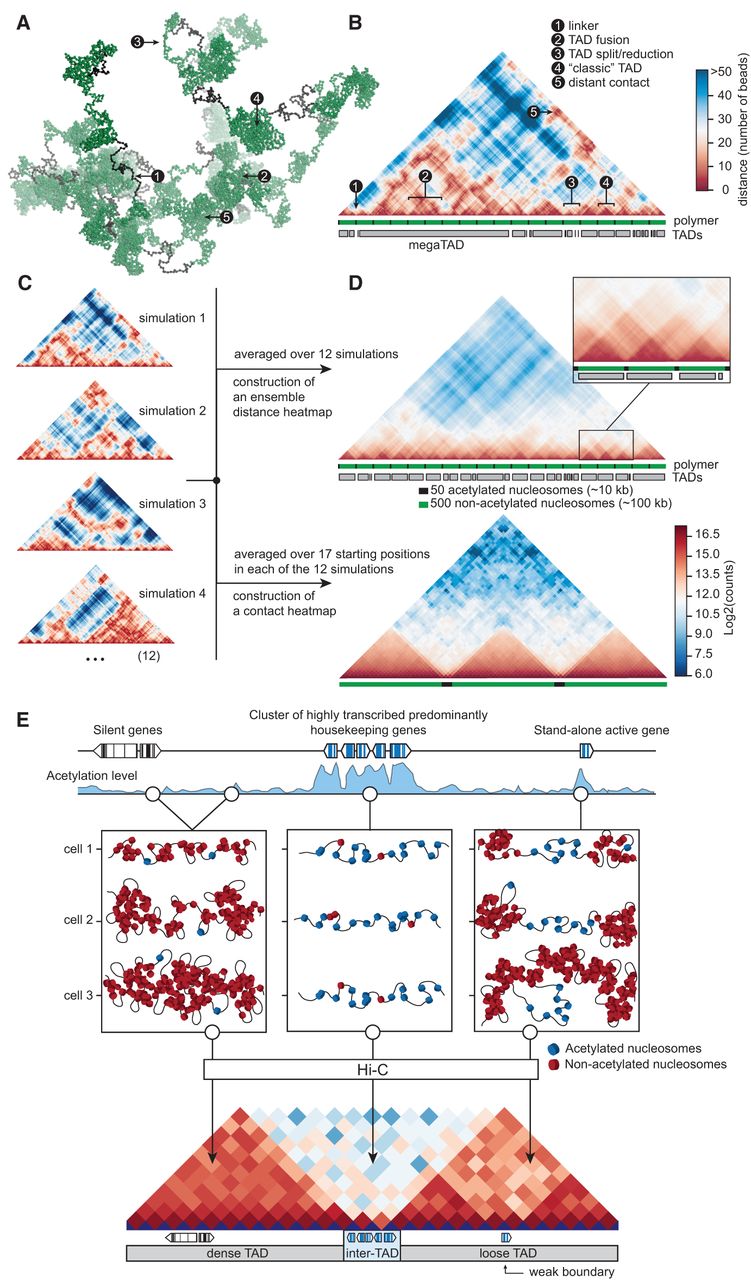 Computer simulation of a linear polymer that folds into a set of TADs supports a key role of hyperacetylated chromatin in separation of TADs. (A) One of the predicted spatial configurations of a polymer composed of 19 blocks of inactive (interacting) nucleosomes (500 nucleosomes each, green) interspaced by shorter blocks of active noninteracting nucleosomes (50 nucleosomes each, black). (B) Spatial proximity map (distance heat map) of the polymer configuration presented in A. Distances are measured in numbers of nucleosomes. A scheme of the model polymer and positions of TADs predicted by the Armatus algorithm are shown below the map. (C) Distance heat maps of the four individual configurations of the model polymer. Configuration 1 is used in A and B. (D) Distance heat map (upper) and contact heat map (simulated Hi-C map constructed at resolution of 4 kb [20 beads] for three consecutive TADs, lower) of the model polymer obtained by the averaging of the heat maps of 12 individual configurations. Notation as in B. (E) A schematic illustrating the proposed model of chromatin folding into TADs/inter-TADs, as directed by the self-association of nucleosomes. A high acetylation level of the chromatin within the genomic regions harboring actively transcribed genes interferes with chromatin packaging into TADs due to decreased inter-nucleosomal interactions.