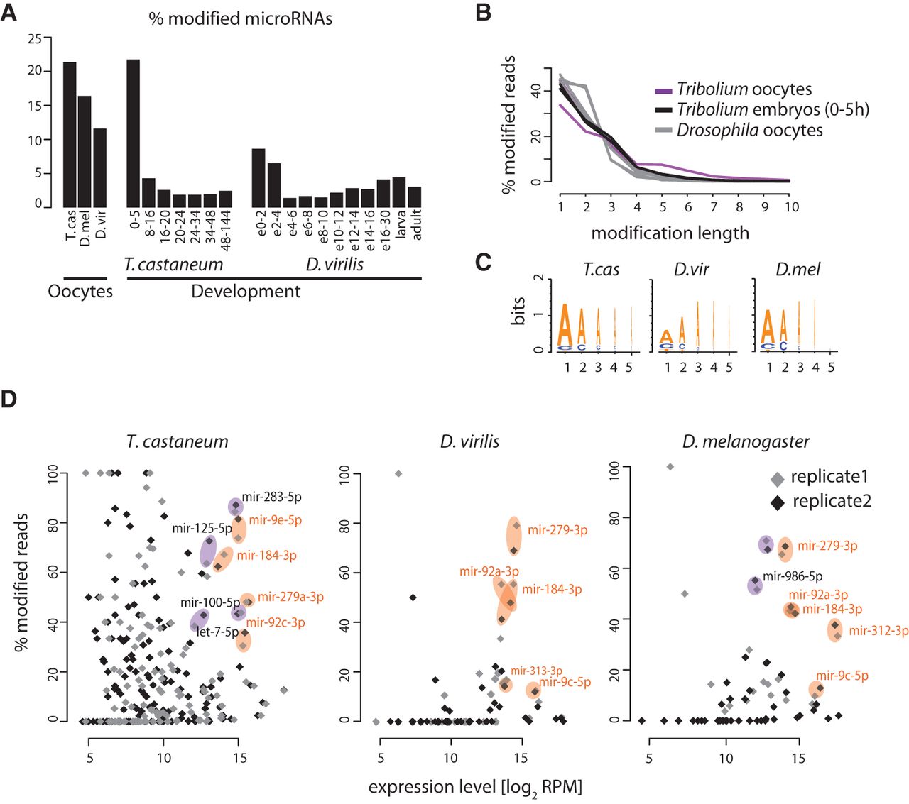 Nontemplated 3′-end nucleotides in oocyte microRNAs. (A) Proportion of microRNAs with nontemplate 3′-end nucleotide addition in oocytes and developmental small RNA libraries of T. castaneum and Drosophila. (B) Length distribution of nontemplate 3′-end nucleotide additions. (C) Sequence logos showing the most frequent nucleotides in the first five positions of the 3′-end nontemplated nucleotide additions in the three species. (D) Scatter plots showing the proportion of reads with nontemplate 3′-end additions as a function of the total read counts (modified and nonmodified) per million for each microRNA. Results of different replicates for each species are shown separately. Example singleton microRNAs or microRNAs from clusters that are conservatively deposited in the egg are highlighted in orange, and highly deposited and strongly modified microRNAs specific for a given species are highlighted in purple.