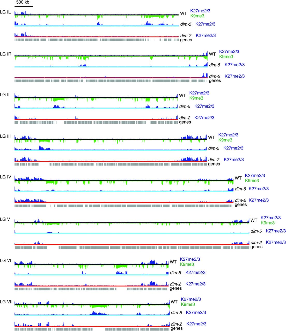 Distribution of H3K27me2/3 is mostly unaffected by elimination of DNA methylation, but loss of H3K9me3 in the dim-5 mutant causes redistribution of H3K27me2/3 to constitutive heterochromatin. ChIP-seq tracks of H3K27me2/3 in wild-type, dim-5, and dim-2 strains are displayed in dark blue, and tracks of H3K9me3 are displayed in green (inverted; shown for the wild-type strain only). While genome-wide redistribution of H3K27me2/3 was observed in a dim-5 strain, the vast majority of H3K27me2/3 domains were unchanged in a dim-2 mutant, with the exception of three novel H3K27me2/3 domains on LG VI, one of which normally sports H3K9me3. The black, light blue, and red lines indicate tracks of H3K27me2/3 ChIP-seq performed in wild-type, dim-5, and dim-2 strains, respectively. Predicted genes are displayed as gray rectangles below the ChIP-seq tracks. The scale bar (500 kb) applies to all seven chromosomes.