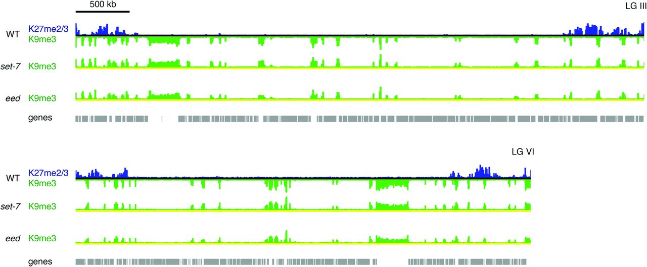 Constitutive heterochromatin is unaffected by loss of facultative heterochromatin. The distribution of H3K9me3 in the set-7 and eed strains (green tracks; distinguished by yellow lines) is not appreciably different from the distribution of H3K9me3 in the wild type (inverted green track; below black line). The distribution of H3K27me2/3 in the wild type is shown for reference (blue track; above black line). The scale bar (500 kb) applies to both chromosomes.