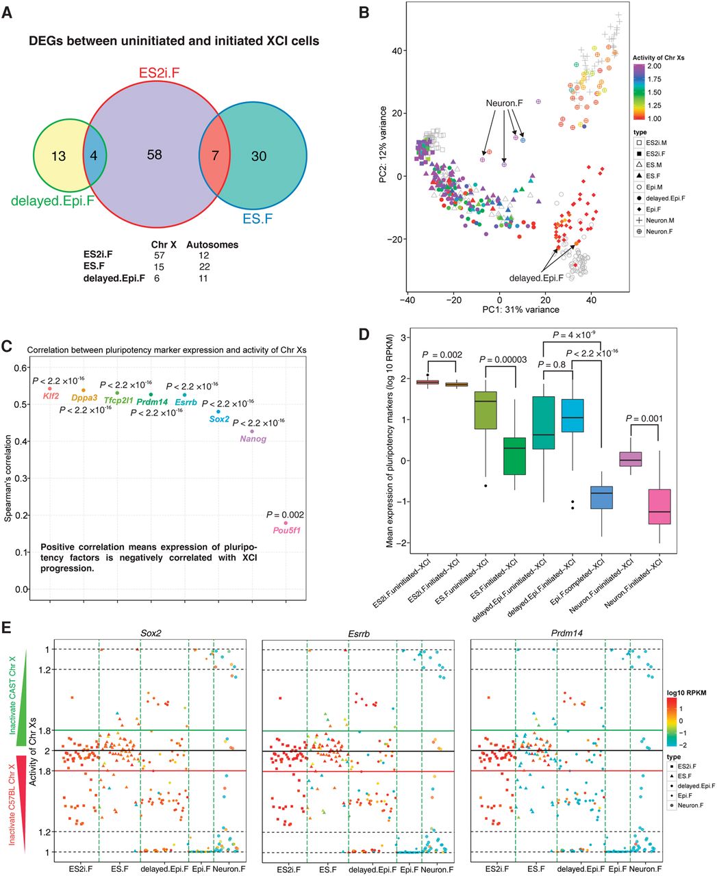 Association between pluripotency, differentiation, and XCI progression across different developmental states. (A) Venn graph for DEGs between uninitiated- and initiated-XCI cells. Female cells were divided into two distinct XCI state groups: (1) uninitiated-XCI (1.8< activity of Chr Xs ≤2); and (2) initiated-XCI (1≤ activity of Chr Xs ≤1.8). Adjusted P < 0.01. (B) Each female cell is colored by the corresponding activity of Chr Xs in PCA. Male cells are shown in gray. Two delayed.Epi.F cells with completed-XCI (arrows, 1≤ activity of Chr Xs ≤1.2) clustered together with Epi.M cells. Four Neuron.F cells with uninitiated-XCI (arrows) were closer to ES cells but further away from other Neuron.F cells. (C) Spearman's correlation between expression of pluripotency genes and the activity of Chr Xs. (D) Comparison of pluripotency gene expression between cells of uninitiated- and initiated-XCI groups for each condition. Epi.F only contained cells from completed-XCI group (1≤ activity of Chr Xs ≤1.2). The y-axis represents mean expression of eight pluripotency genes (Pou5f1, Sox2, Nanog, Klf2, Esrrb, Dppa3, Tcfcp2l1, and Prdm14). Student's t-test was applied to examine the significance of the expression difference between two distinct XCI groups. (E) Overview of the activity of Chr Xs and expression of pluripotency genes for Sox2, Esrrb, and Prdm14 in each cell.