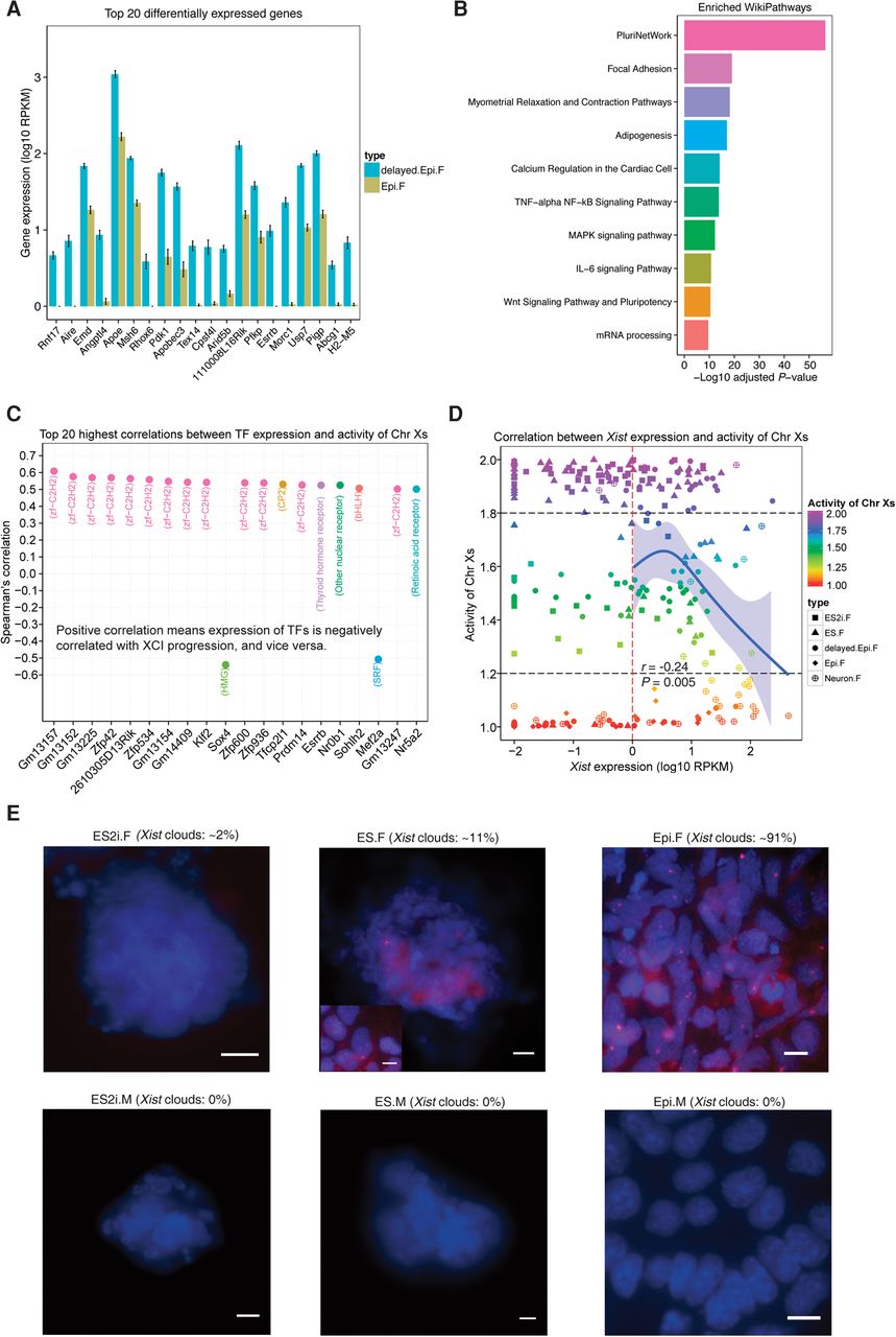 Underlying factors associated with delayed progression of mEpiSCs and heterogeneity in expression of Xist. (A) Top 20 DEGs between delayed.Epi.F and Epi.F cells (sorted by adjusted P, mean ± SEM). Cutoff: adjusted P < 0.01. (B) Top 10 significantly enriched WikiPathways for the DEGs between delayed.Epi.F and Epi.F cells. (C) Top 20 highest correlations between TF expression and the activity of Chr Xs. The family of each TF is shown in the parentheses. Spearman's correlations were with adjusted P < 0.01. (D) Spearman's correlation between Xist expression and the activity of Chr Xs. Confidence interval of 95% for the curve of Natural Spline is shown. (E) RNA FISH of Xist shown for female and male ES2i, ES, and Epi cells. Xist clouds are in red, and nuclei are in blue (DAPI staining). For ES.F cells, Xist clouds are shown in two different morphologies (colony and the metastable cells). The percentage of Xist clouds was calculated per 100 cells from multiple images (n = 6) per condition. The Xist clouds were imaged with 0.3 μm z-stack. (Scale bar) 10 μm.