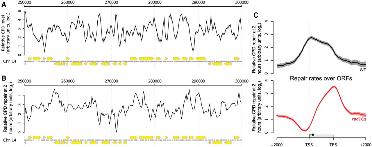 Genome-wide UV-induced DNA repair is organized around gene structure. (A) A linear genome plot of a section of Chromosome 14 showing 3D-DIP-Chip results from wild-type cells. The black line shows the mean (n = 3) CPD level observed immediately after UV irradiation (100 J/m2, shading highlights the SEM). Gray dots indicate the positions of microarray probes. Yellow arrows indicate ORF positions and their direction of transcription. CPD levels are plotted as arbitrary units on the y-axis. (B) CPD repair rates displayed in a linear genome plot. The black line shows the mean of CPD levels 120 min post-UV (n = 2) subtracted from the mean at 0 min post-UV shown in A. Annotations are as described in A. (C) Relative rates of CPD repair around ORF structures. Solid lines show the mean of CPD repair rates in wild-type (n = 3, black line) and rad16Δ cells (n = 2, red line). Shaded areas indicate the SD, with CPD levels plotted as arbitrary units on the y-axis.