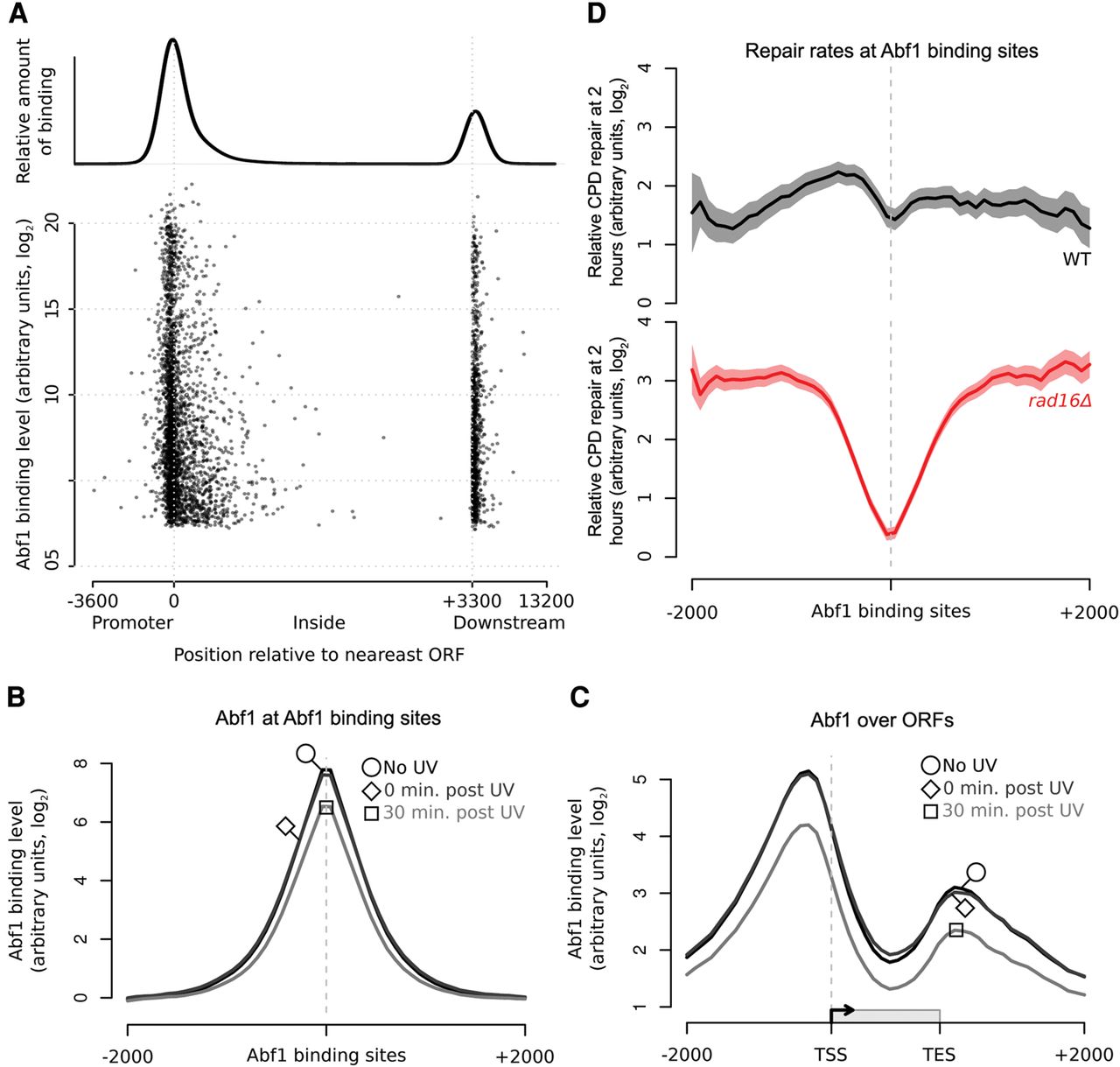 GG-NER is organized from Abf1 binding sites, and Abf1 occupancy does not change significantly in response to UV. (A) The positions of Abf1 binding relative to ORFs. Abf1 binding levels at the ∼3800 detected binding sites are shown. Each binding site is represented by a single data point, with the overall relative amount of binding throughout the region shown above. (B) ChIP-chip data for Abf1 binding. Data are shown for unirradiated (black, circle), 0 min post-UV (dark gray, diamond), and 30 min post-UV (light gray, square) cells. Solid lines show the means of three data sets per time point. (C) As in B, plotted around ORF structure. (D) Relative CPD repair rates around Abf1 binding sites. The data depicted in Figure 1C are used here to plot the relative rates of CPD removal around Abf1 binding sites in wild-type (black) and rad16Δ cells (red). Solid lines show mean CPD repair rates in wild-type (n = 3, black line) and rad16Δ cells (n = 2, red line). The shaded areas show the SEM and SD, with CPD levels plotted as arbitrary units on the y-axis.