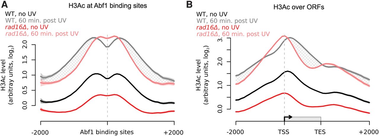 Histone H3 acetylation levels in response to UV irradiation in wild-type and rad16Δ cells depend on the GG-NER complex. (A) Histone H3 acetylation in wild-type (n = 5, black/gray) and rad16Δ (n = 3, red/pink) cells in response to UV irradiation around Abf1 binding sites. The hatched areas define the genomic regions of GG-NER-dependent UV-induced histone H3 acetylation. Solid lines show the mean, and shaded areas show the SEM. (B) As in A, plotted around ORF structure.