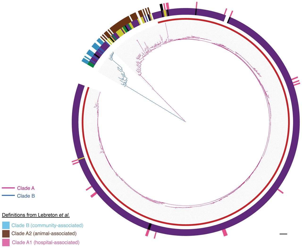 Population structure of E. faecium. Maximum likelihood tree based on SNPs in the 1288 genes core to the 506 isolates from this study and 73 isolates reported by Lebreton et al. (2013). Pink branches indicate Clade A; blue branches, Clade B. Inner incomplete red ring denotes the clonal expansion of Clade A. Middle ring shows the isolate source (yellow, animal; purple, clinical; blue, nonhospital; black, hospital-associated feces/surveillance/outbreak/unknown; green, other; white, unknown). Outer ring shows isolates from Lebreton et al. (2013) colored by the clade to which they were originally assigned (pink, Clade A1; brown, Clade A2; blue, Clade B; black, hybrid Clade A1/B). Scale bar, 9593 SNPs.