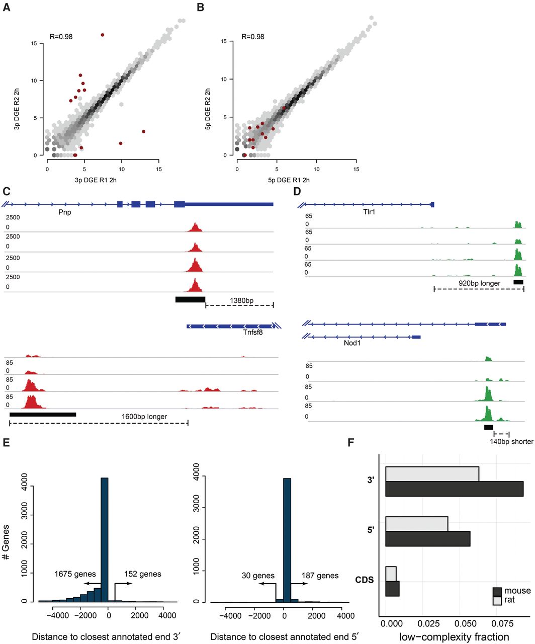 Common problems in end-sequence analysis. (A,B) Scatter plots of gene expression computed from 3′ (A) and 5′ (B) libraries made from technical replicates of mouse bone marrow–derived dendritic cells (mBMDCs) 2 h after LPS stimulation. Red dots highlight outliers (at least 10-fold difference between replicates in 3′ libraries). (C,D) Examples of annotated TSSs and TTSs that do not correspond to observed start and end sites in our samples. Read coverage is normalized to library size. (E) Distance from the most highly enriched window within each gene to the annotated TTS for the 2-h 3′ library (left) and to the TSS for the 5′ library (right). (F) Fraction of repetitive sequence in 3′ UTRs, 5′ UTRs, and coding sequence (CDS) as estimated by RepeatMasker, downloaded from the UCSC Genome Browser (Smit et al. 2004; Rosenbloom et al. 2015), in mouse (black) and rat (gray) annotated genes.