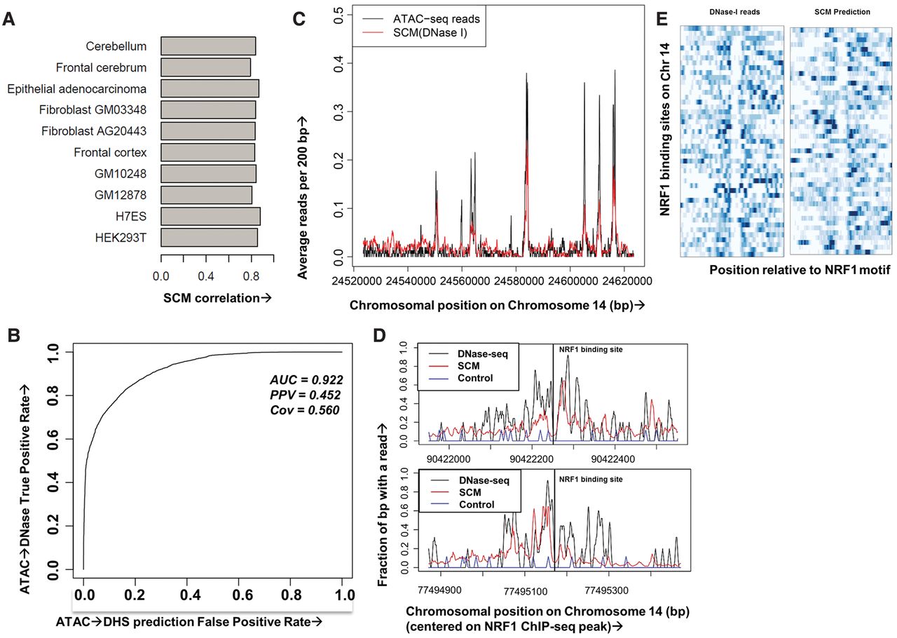 SCMs predict chromatin accessibility at base pair resolution across cell types and data types. (A) Pearson correlation coefficients on held-out Chromosome 14 DNase-seq data for SCMs trained on DNase-seq from 10 cell types. (B) Receiver–operator curve (ROC) showing predictive accuracy of a SCM trained on GM12878 DNase-seq data at predicting held-out GM12878 ATAC-seq peaks. (C) Example human GM12878 held-out genomic region showing ATAC-seq reads (black) and reads predicted from a DNase-seq trained SCM (red), both smoothed at 200 bp. (D) Example human GM12878 held-out genomic region showing 10-bp smoothed DNase-seq reads (black), SCM-predicted reads (red), and reads from a control model trained on IMR-90 naked DNA DNase-seq data (blue) surrounding two NRF1 binding sites (vertical black lines denote binding call). (E) Heatmap showing clear footprints for both DNase-seq and SCM at NRF1 binding sites on Chromosome 14.