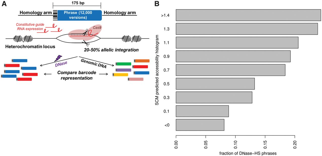 SCMs predict sequence-dependent chromatin accessibility in a high-throughput SLOT screen. (A) In SLOT, a library of 12,000 175-bp DNA sequences containing 100-bp variable phrases is PCR amplified to add a 67-bp homology arm to each end. mESCs stably expressing a guide RNA targeting a natively heterochromatin region are co-electroporated with the DNA library, Cas9, and additional guide RNA, resulting in a population of cells in which 20%–50% of alleles at a single genomic locus have phrase incorporation. Comparison of phrase representation between genomic DNA and DNase I hypersensitive DNA reveals the subset of phrases encoding chromatin accessibility in this controlled genomic context. (B) Fraction of phrases, grouped by their overall SCM-predicted chromatin accessibility (y-axis), that are DNase I hypersensitive in a SLOT assay (x-axis). The units shown are only appropriate for trend comparison.