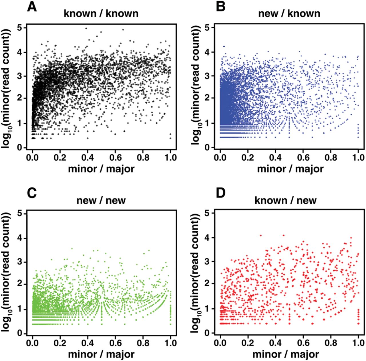 The relative abundance of novel versus known junctions in alternatively spliced pairs within WormBase gene models. For each splice junction site that could be spliced to two or more other sites, i.e., alternatively spliced, we calculated the ratio of reads for each minor form versus the major form and the numbers of reads spanning the minor form. (A) Sites where both the major and minor isoforms were both present in WormBase. (B) Sites where the major isoform was present in WormBase but the minor form was not. (C) Sites where neither the major nor minor isoform were present in WormBase. (D) Sites where the minor form was present in WormBase, but not the major isoform. For the case in which the minor form is novel and the major form is known (B), a larger fraction of the minor form junctions are rare, e.g., ≤100 reads and ≤5% of the major form, than in the case in which both forms are known (A). However, the absolute number of pairs in which the minor form is not rare is almost twice the number of junctions annotated in WormBase (6782 versus 3428), and the other two cases (C,D) add another 4527 relatively well represented alternatively spliced junctions not in WormBase. The rare junctions could represent splicing errors, but considering their overlap in representation with junctions annotated in WormBase, they could also be biologically important.