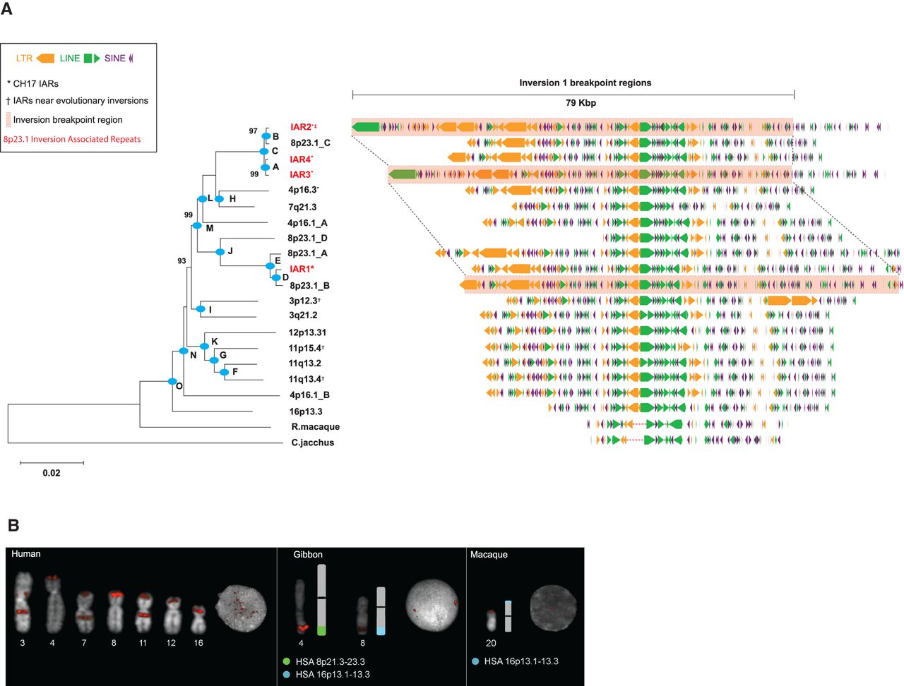 Phylogenetic and comparative analysis of IAR core duplicons. (A) Phylogeny of the core duplicon based on an unrooted neighbor-joining tree (MEGA5) from a 9.2-kbp MSA constructed from 21 IAR core sequences obtained from human and nonhuman primate genome assemblies. Allelic H2 IARs overlapping 8p23.1 inversion breakpoint regions are highlighted in red. The phylogeny shows that the core originated from 16p13.3 and subsequently expanded to various chromosomes early in the ape lineage after divergence from the Old World monkey (see Supplemental Table 10 for timing estimates for nodes A–O, and bootstrap support is indicated). Repeat analysis of a 79-kbp segment associated with the inversion (highlighted) shows that 80% of the structure consists of various classes of common repeats, including LINEs (green), LTRs (orange), and SINEs (purple). (B) FISH analysis using a probe containing core IAR sequences from the gibbon BAC library (CH271-9G12) for human, gibbon (Nomascus leucogenys), and macaque (Macaca mulatta) chromosomal metaphase spreads. Gibbon signals are observed on Chromosomes 4 and 8, which are partially homologous to human Chromosomes 8 (8p21.3–23.3, displayed in light green) and 16 (16p13.1–13.3, displayed in light blue). Macaque signals on Chromosome 20 are homologous to human Chromosome 16p13.3.