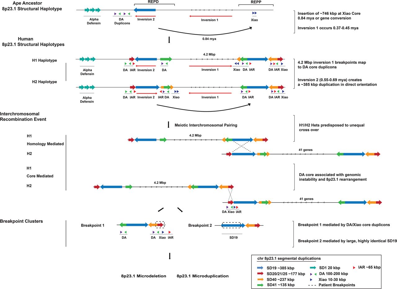Chromosome 8p23.1 evolutionary and instability model. The model shows the evolution and organization of SDs at Chromosome 8p23.1. Colored arrows represent the largest and most highly identical SDs spanning the critical region. At the top, a schematic of the likely primate ancestral organization of the region based on the sequence assembly of the orangutan REPD and REPP units excluding lineage-specific expansions. A ∼746-kbp duplicative transposition or gene conversion to the proximal side of REPP occurred ∼0.84 mya ± 0.99 (see Supplemental Section 4.2 for timing estimate) and inserted into the Xiao core duplicon at REPP. Two large-scale inversions led to the formation of H2 and H1 in the human lineage (0.5–0.6 mya) with breakpoints associated with the DA/Xiao core duplicons. The H1/H2 configuration promotes interchromosomal nonallelic homologous recombination (NAHR) between directly orientated SDs (SD19, blue arrow) that flank the disease-critical region. The size (385 kbp) and large number of tracts of perfect sequence identity suggest that these rearrangements are driven by NAHR in a subset of patients (n = 3). The second group of patients (n = 4) shows breakpoints mapping to a second pair of duplications (SD20-25, red arrow) corresponding to the DA/Xiao core duplicon. The pair is smaller with only three tracks of perfect sequence identity (>500 bp). We propose that group 2 patients arise as a result of recombination between DA/Xiao core instability elements. Colored arrows represent the length and orientation of SD pairs on each haplotype >100 kbp. The positions of the DA, Xiao, and IAR elements are indicated beneath the SDs (green, purple, blue, and red triangles).