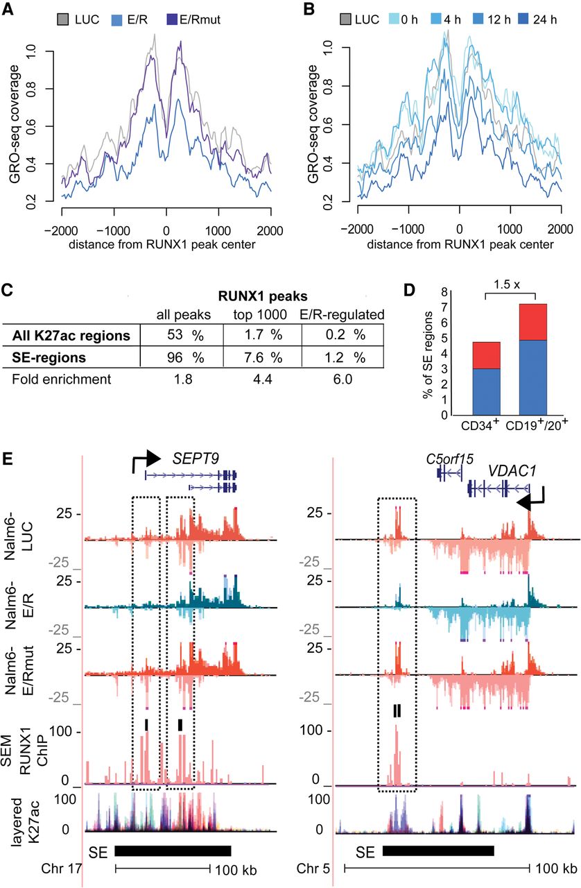 eRNA transcription profiles reveal E/R targets and repression at SE regions. Histograms of GRO-seq coverage are shown at RUNX1-bound genomic regions comparing control (LUC), E/R mutant (E/Rmut), and wild-type E/R samples (A) and across the time series of E/R induction (B). Signal profile represents the most prominent intergenic RUNX1 ChIP peaks from SEM cells centered by the RUNX1 motif. Early repression of eRNAs is evident at the center of RUNX1-bound sites upon expression of E/R but not E/Rmut. (C) Enrichment of RUNX1 ChIP peaks in SEM cells at SE regions over regular H3K27ac regions is shown. The fold enrichment at SE regions is indicated for all peaks (P-value <10−50), top 1000 peaks (P-value 5.2 × 10−44), and E/R-regulated RUNX1 peaks (P-value 1.6 × 10−10). (D) Proportion of E/R-regulated SE regions in CD34+ or CD19+/CD20+ cells is shown as bar plots. Down-regulation and up-regulation are indicated in blue and red, respectively. In total, 37 of 500 SEs in CD19+/CD20+ were regulated by E/R, a 1.5-fold excess compared to CD34+ cells (22 of 452 SEs in CD34+). (E) GRO-seq signal tracks at representative E/R-regulated SEs are shown. Repression of eRNA signal at prominent RUNX1 ChIP peaks (highlighted in the figure) is observed in the vicinity of SEPT9 and VDAC1 genes. Transcript variants 10 and 11 of SEPT9 are shown in the RefSeq track. Two biological replicates of each GRO-seq sample (Nalm6-LUC, Nalm6-E/R, Nalm6-E/Rmut) are shown with different shades of color, and signals above and below the axis indicate plus and minus strands, respectively. RUNX1 ChIP peaks in SEM cells are shown in light red overlaid with the input control in shades of blue and purple. SE track is based on CD19+/20+ cell data from Hnisz et al. 2013. Layered H3K27ac track indicates active enhancers and is shown as an overlaid signal from seven cell lines retrieved from ENCODE (The ENCODE Project Consortium 2012). Color key: GM12878, red; H1-hESC, yellow; HSMM, green; HUVEC, light blue; K562, blue; NHEK, purple; NHLF, pink.