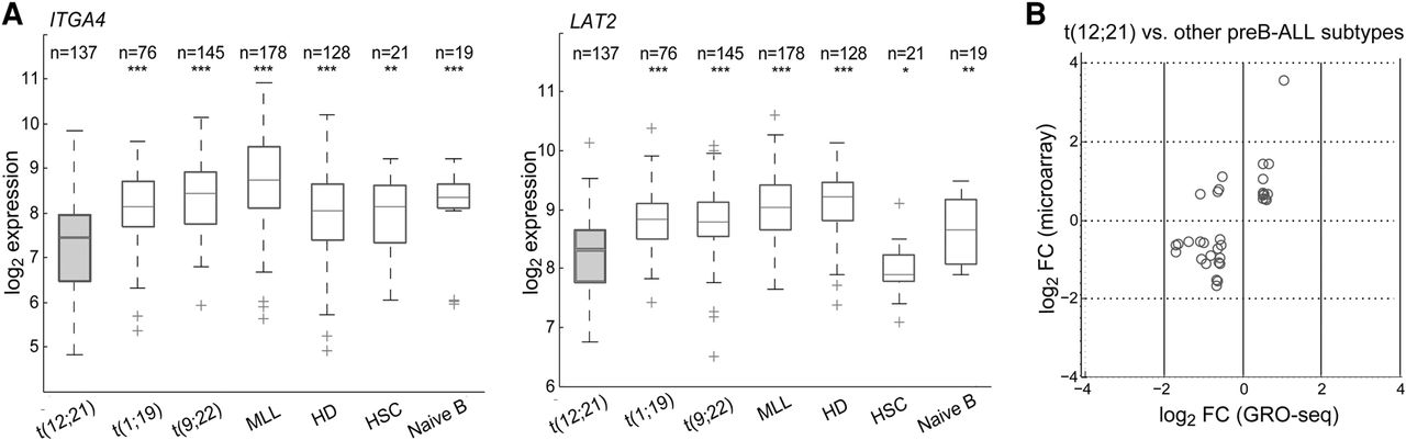 Patient data indicate that E/R-perpetuated changes persist at diagnostic samples. (A) Expression of ITGA4 and LAT2 in microarrays shows repression among E/R-positive patients compared to other subtypes: (MLL) KMT2A (MLL) rearranged; (HD) hyperdiploid; (HSC) hematopoietic stem cells. In each comparison, statistical significance (Mann-Whitney U test) was tested against the E/R-positive subtype: (***) P < 0.001; (**) P < 0.01; (*) P < 0.05. (B) Concordance between differentially expressed genes on GRO-seq and combined microarray (Pearson's correlation coefficient 0.529, P = 0.0011) (Supplemental Table S7).