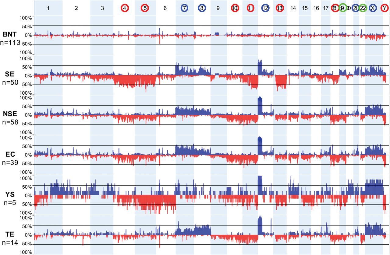 Somatic copy number aberration (SCNA) profiles in TGCT subtypes. (Top) Blue and red circles around chromosome numbers indicate recurrent shared SCNA gains and losses, respectively; green circles, chromosomes relatively gained in SE versus NSE. (Next three panels) Aggregate view of BNTs, SEs, and NSEs. (Bottom three panels) NSEs were further subtyped as EC, YST, and TE. SCNAs were computed from 450K-methylation array signal intensities (see Methods). Tumor inclusion criteria required the presence of gain of the short arm of Chromosome 12p. For abbreviations used, see text.