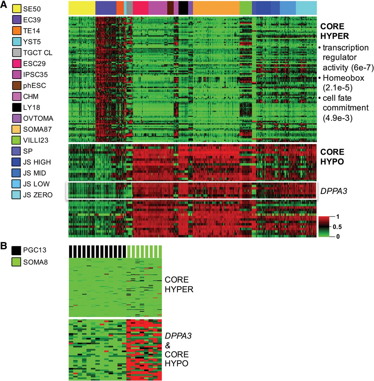 Core TGCT methylation. The nonseminomas (ECs, TEs, and YSTs) were collectively compared with reference samples. (A) Heatmap of the TGCT core hypermethylation module (“core hyper,” n = 100 targets) (Supplemental Table S3) across the four TGCT subtypes and multiple references. SEs show erasure for the otherwise TGCT-hypermethylated module, as shown in this unclustered heatmap. Functional annotation of core hypermethylated genes using the DAVID Functional Annotation Clustering Tool revealed significant enrichment for transcription regulatory, homeobox, and cell fate commitment genes (FDR shown in parentheses at right). Among the “core hypo” targets (Supplemental Table S3), seven of 39 targets map to DPPA3. (B) PGCs are erased for both core hyper- and hypomethylated targets, while embryonic somatic tissues serve as an internal control and show inverse methylation of the modules relative to TGCTs. For abbreviations used, see text.