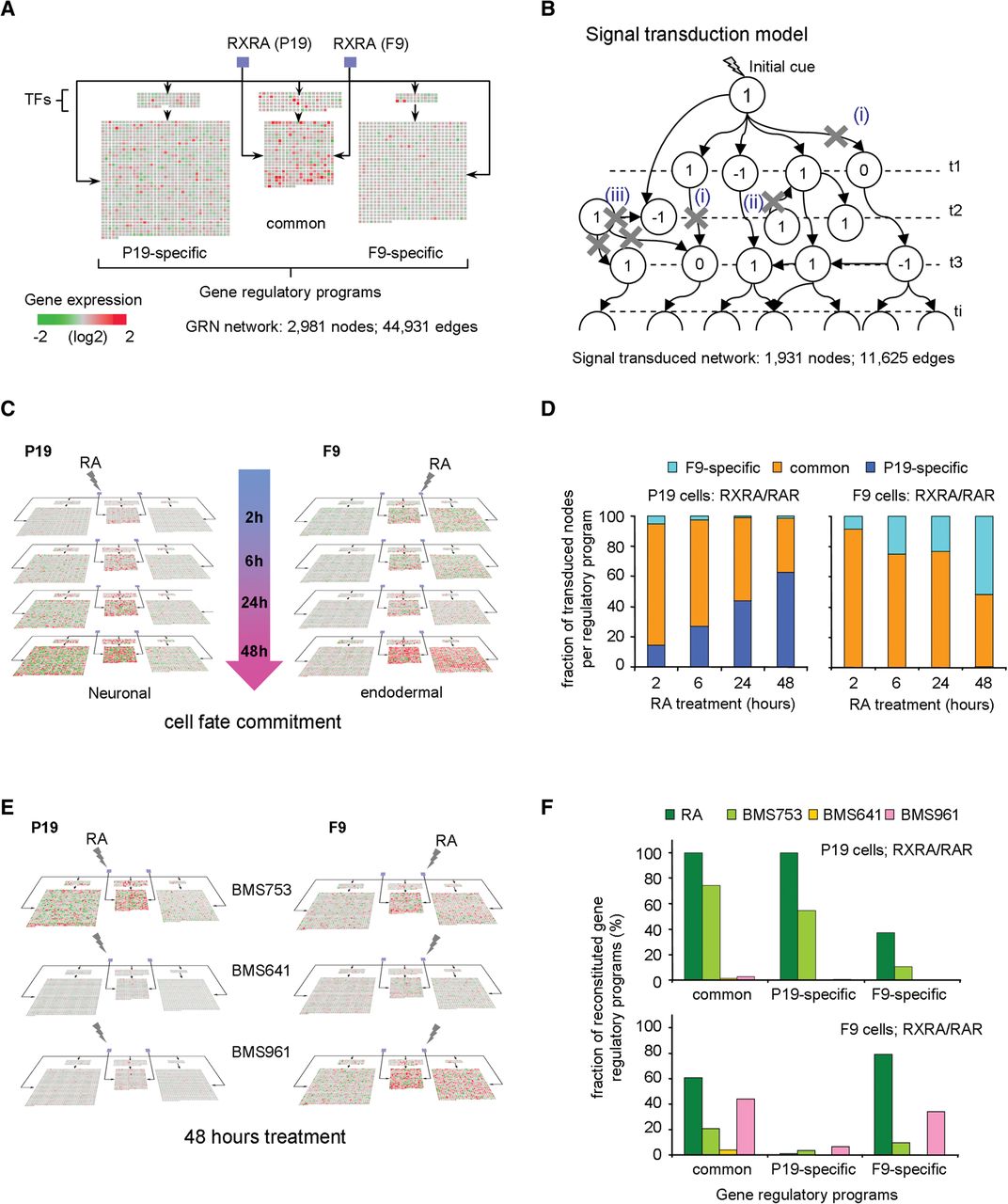 Temporal signal propagation in RA-induced GRNs for neuronal and endodermal cell fate decisions. (A) Structure of the reconstructed GRN displaying genes that are selectively or commonly regulated during neuronal and endodermal cell differentiation. For illustration purposes, all edges were removed; arrows indicate the direct regulation of each of these programs by TFs that are bona fide direct RA responsive genes (blue squares; black arrows). Gene expression changes are illustrated as heat maps. (B) Signal transduction model aiming at evaluating the coherence between the reconstructed GRN and the temporal gene expression changes. The starting node where the initial cue activates the signal transduction is depicted, as well as the downstream node interconnections required for its propagation. The temporal transcriptional state for each node is defined as 1, 0, or −1 (up-regulated, nonresponsive, or down-regulated, respectively). The model excludes signal cascade progression branches (illustrated by crosses) when (1) the state of a node remains nonresponsive; (2) the directionality of the TF-TG relationship is opposite to the temporal signal flux; or (3) the TF-TG relationships are not part of the main signal transduction propagation branches. (C) Temporal transcriptional evolution of the reconstructed GRNs in P19 or F9 RA-induced cell differentiation. Note that common programs dominate at early time points, while the neuronal/endodermal programs take over at late time points. (D) Fraction of transduced nodes per regulatory program for both model systems (F9-specific, common, P19-specific), as assessed by the signal transduction model. As illustrated in C, the common gene regulatory program is activated early (>80% in both cell lines after 2 h of RA treatment), while the cell fate-specific program is set up progressively (∼60% of specific programs in either of the model systems after 48 h of RA). (E) Responsiveness of common and neuronal-/endodermal-specific GRNs described in A to agonists selective for the three RAR isotypes. (F) Fraction of reconstituted gene regulatory programs (GRPs) (after 72 h of RA treatment) in both model systems when either the RA or RAR-specific agonists-derived transcriptomes are used for modeling signal transduction propagation.