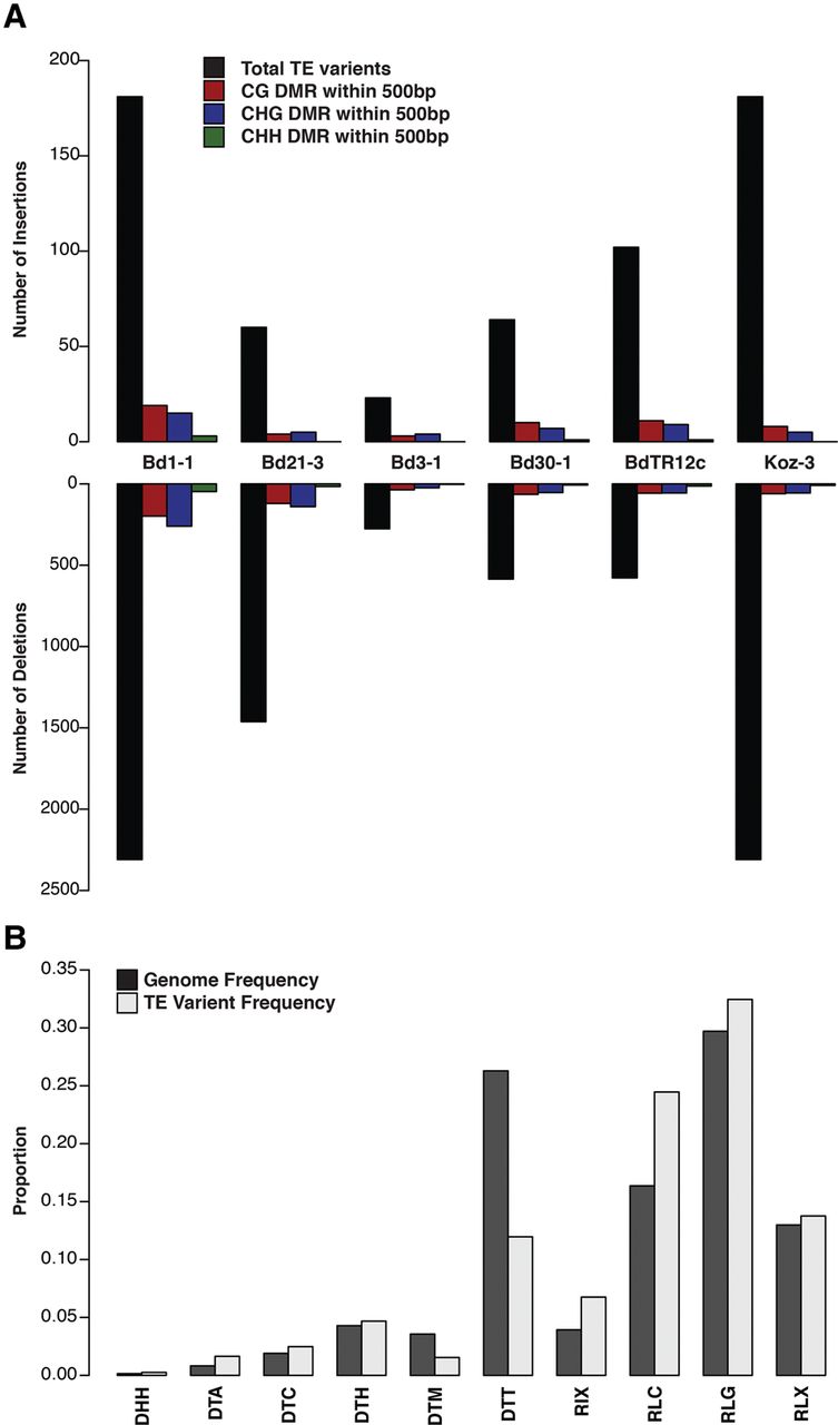 Transposable element polymorphisms across sequenced lines. (A) Bar plot indicating total number of transposable element insertions and deletions compared to the Bd21 reference along with the number of DMRs found within 500 bp for each sequence context. (B) Bar plot of transposable element families. The genomic frequency of each family (black bars) is compared with the frequency of identified TE insertions and deletion (gray bars).