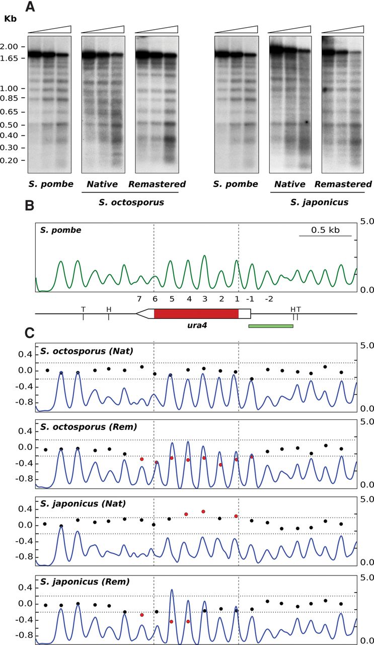 Engineering nucleosomal positioning on eukaryotic coding DNA sequences. (A) MNase end-labeling analysis of wild-type S. pombe ura4 (left panel). The pattern of internucleosomal bands becomes more diffused when the S. pombe ura4 ORF is replaced by the native S. octosporus or S. japonicus ORFs. The original sharp profile is restored when the codons of the two ORFs are replaced by synonymous codons, with the highest score in the PSWM of S. pombe (Remastered). (B) Nucleosome occupancy map of wild-type S. pombe. Restriction sites for HindIII (H) and TfiI (T) and the localization of the hybridization probe (green bar) are indicated. (C) Nucleosome occupancy maps of the strains harboring the native (Nat) and remastered (Rem) ura4 ORF of S. octosporus and S. japonicus (blue). DANPOS analysis of nucleosome positioning of the four mutant strains relative to the wild type. Symbols are as in Figure 1.