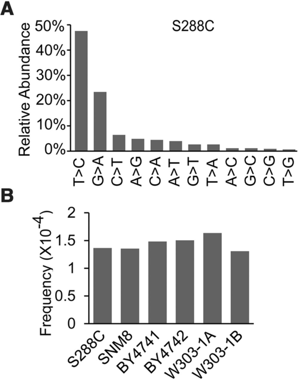 RNA–DNA sequence differences in S. cerevisiae. (A) Twelve types of RDDs are found in S288C. (B) RDD frequencies are similar in six wild-type strains (1.3–1.8 per 10,000 nucleotides).