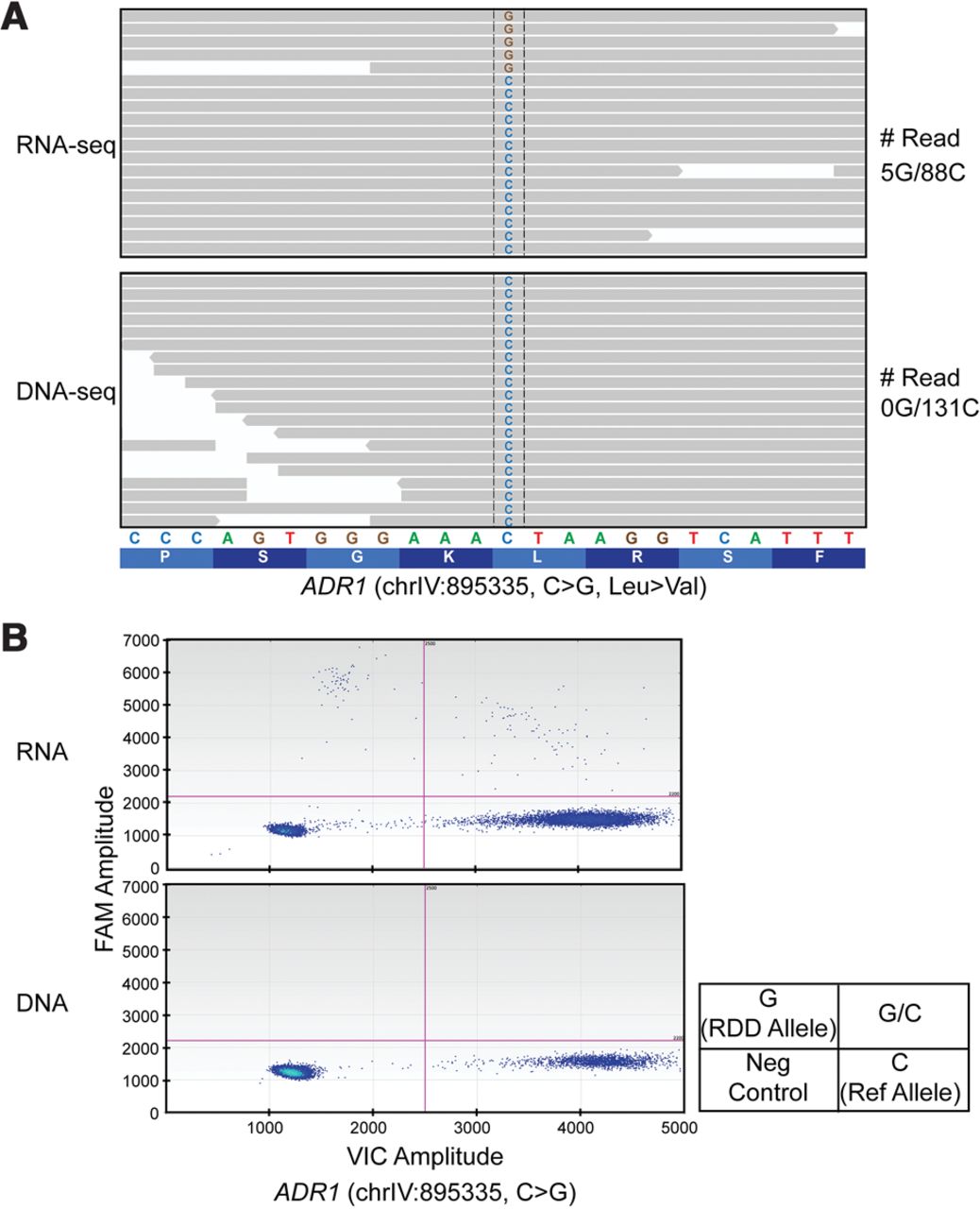 Representative example of an RDD identified by deep sequencing and droplet digital PCR. A C-to-G RDD in coding exon of ADR1 shown by RNA-seq and DNA-seq data on the Integrated Genomics Viewer (A) and by droplet digital PCR (B).