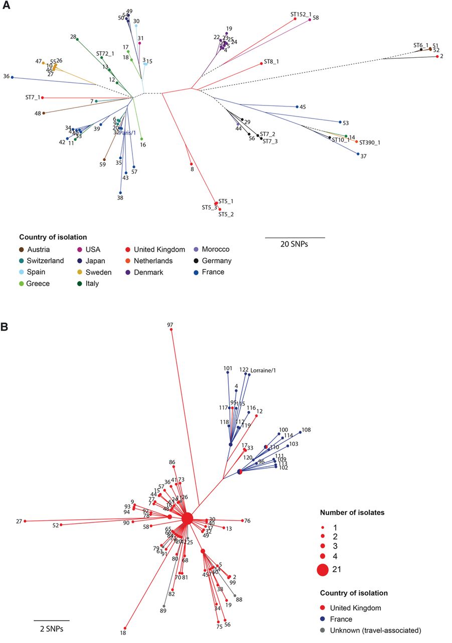 Maximum likelihood trees of 71 ST1 and 122 ST47 isolates. (A) A phylogeny of ST1 isolates, constructed using 867 SNP differences remaining after recombined regions were removed. (B) A phylogeny of ST47 isolates, constructed using 186 SNP differences. Isolates are colored according to the country of isolation, and branches are similarly colored to indicate the origin of descendant nodes. A black dotted line is used where there are descendant nodes from multiple countries. The scales indicate the number of SNPs that have occurred for a given branch length.
