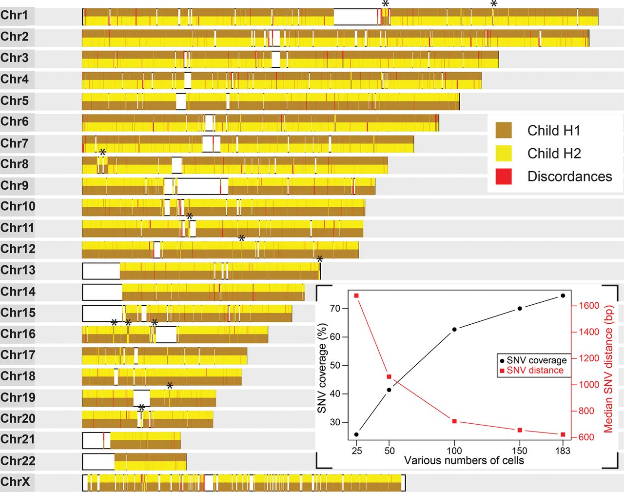 Accurate and dense whole-genome haplotypes are built from multiple single-cell Strand-seq libraries. Assembled haplotypes of the child derived from 183 Strand-seq libraries. Chromosome ideograms illustrate 151,700 high-confidence (covered in more than one cell) heterozygous SNV positions phased from Strand-seq data and compared with the HapMap reference. The consensus haplotypes determined by Strand-seq are depicted for each chromosome, with each SNV represented by a vertical line and color-coded based on whether it matched the child's reference homolog 1 (brown) or homolog 2 (yellow) listed in the HapMap reference. The contiguous haplotypes extend the whole length of each chromosome, spanning centromeres and reference assembly gaps (white blocks). Discordant alleles that did not match either reference haplotype are shown in red. (Asterisks) Short localized switches in haplotypes that were confirmed as homozygous inversions. (Inset) The percentage of HapMap reference SNVs covered (black line) and the median distance between these SNVs (red line) are plotted for various numbers of single-cell libraries (25, 50, 100, 150), randomly sampled from the entire data set of 183 cells.