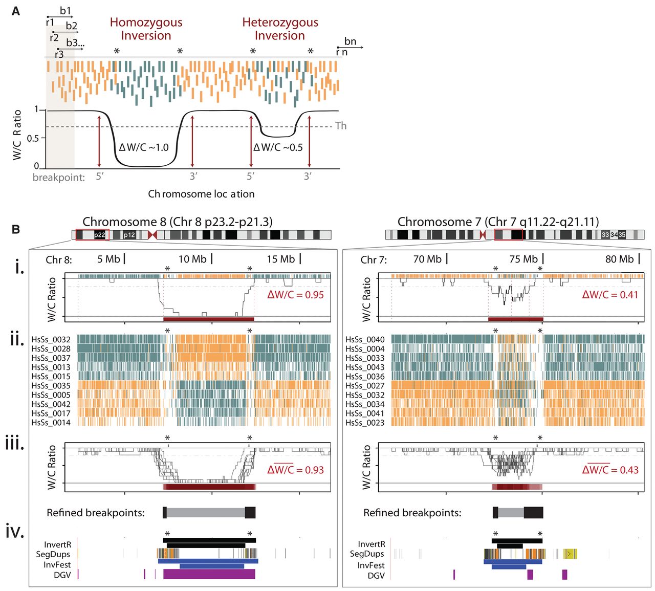 High-throughput characterization of inversions in multiple single cells using Invert.R. (A) Illustration of Invert.R, which steps along each read (r) to survey a user-defined bin (b) and calculates the proportion of Watson (W, orange) and Crick (C, teal) reads (W/C ratio). The bin moves sequentially (b1 to bn) along every read (r1 to rn), and the W/C ratio calculation is repeated and plotted as a histogram (black line). Putative inversions are localized to the genomic region (breakpoints) where the W/C ratio passes a threshold (Th) and genotyped based on the magnitude of change (Δ W/C) at the inverted segment. (B) Zoom of localized Invert.R histograms and corresponding Strand-seq libraries of a homozygous (Chr 8p23; left panel) and heterozygous (Chr 7q11; right panel) inversion, viewed in UCSC Genome Browser (red box). (i) Invert.R output of a single library (shown in Fig. 1E) with predicted breakpoints (dotted lines) and corresponding ΔW/Cs of each inversion (red bar). Asterisks denote regions with low read depth that often flank inversions. (ii) UCSC Genome Browser view of 10 additional libraries from the same donor (iii) with overlaid Invert.R histograms. Sequence gaps (gray bars above histograms) and a heat map of the overlapping inversion predictions (red bars below histograms) are included. The minimal inverted region (inverted segment predicted in 80% of cells, gray bar below histogram) and flanking breakpoint ranges (inverted segment predicted in 20% of cells, black bars below histogram) calculated from all 10 cells. This placed the breakpoint ranges to 7,183,914–7,404,466 (5′) and 11,880,370–12,489,771 (3′) for the Chr 8 inversion, and 72,380,014–72,659,960 (5′) and 73,989,814–75,007,165 (3′) for Chr 7. (iv) Simultaneous view of inversions mapped by Invert.R (black), in relation to segmental duplications (SegDups), and previously reported inversions in the Database of Genomic Variants (DGV, purple) and the Human Polymorphic Inversion Database (InvFest, blue). For Invert.R and InvFest, the minimal inverted region is represented as the lower bar in the track, with the maximal inverted regions (outermost breakpoint ranges) represented as the upper bar.