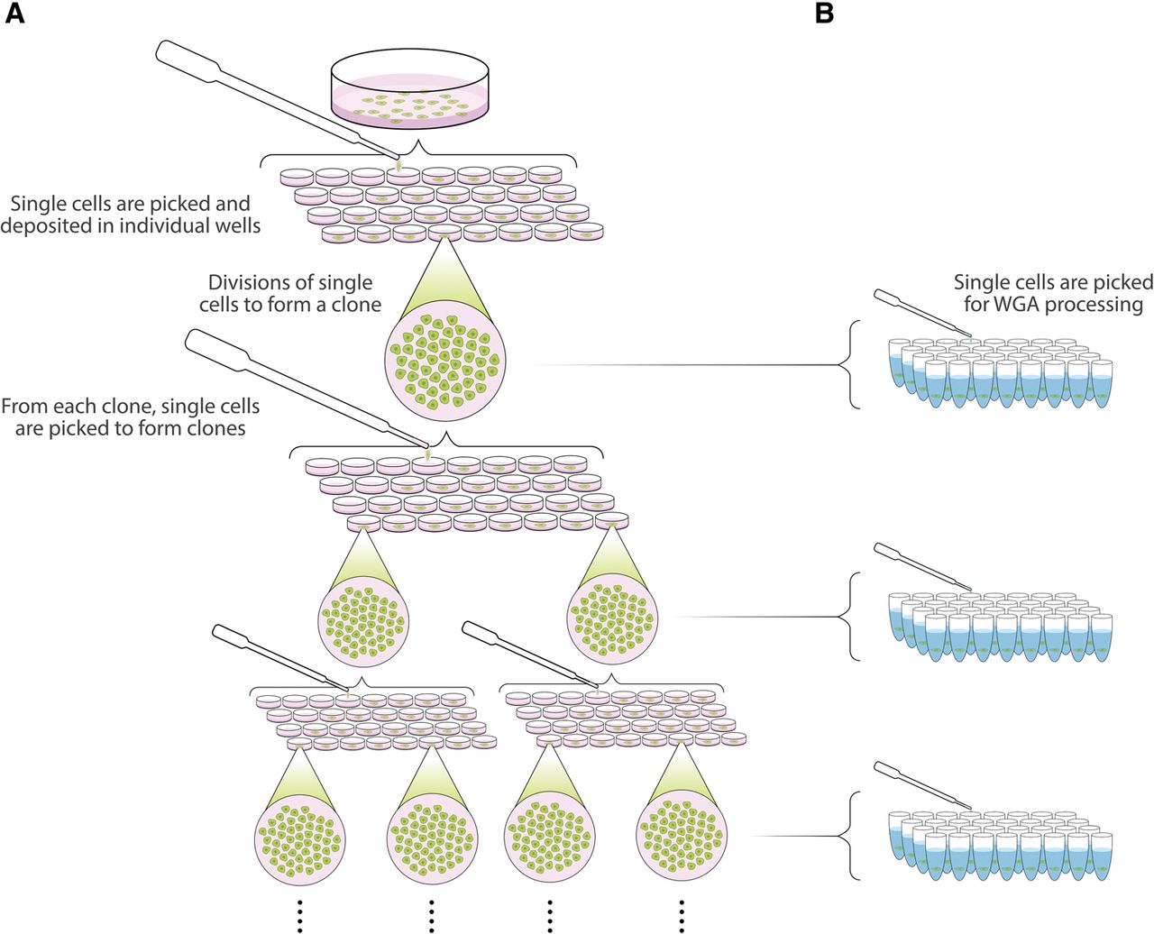 Cell lineage analysis of a controlled ex vivo tree. Schematic representation of the ex vivo SC clone tree experiment. (A) Single cells are picked from a plate to form colonies. After a limited number of cell divisions, cells are picked from each clone to form SC subclones. Repeating this step generates a SC clone tree with a known structure. (B) Collaterally, in each passage in which single cells are selected for SC subcloning, single cells are picked to a PCR plate for WGA and subsequent cell lineage analysis.