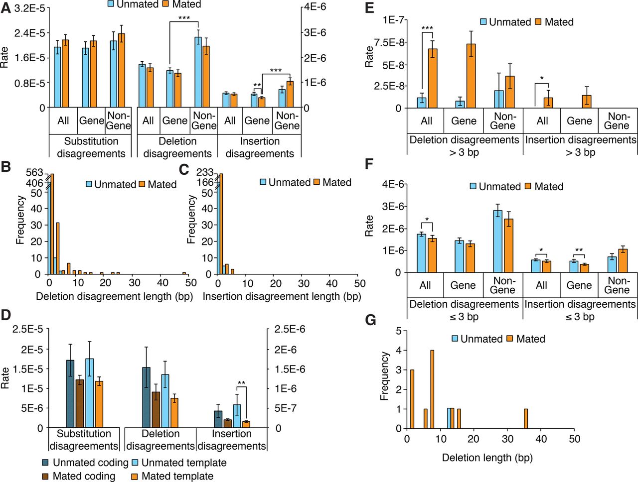 Characterization of duplex disagreements and comparison to deletion lengths. (A) Duplex disagreement rates broken down by genome location. (B,C) Distribution of duplex insertion and deletion disagreement lengths. (D) Duplex disagreement rates broken down by coding or template strand type. (E) Duplex disagreement rates broken down by genome location for disagreements longer than 3 bp. (F) Duplex disagreement rates broken down by genome location, for disagreements not exceeding 3 bp. (G) Deletion lengths. (A, D–F) Error bars, SEM; asterisks denote significance of pairwise differences computed using bootstrapped confidence intervals ([*] P < 0.05; [**] P < 0.01; [***] P < 0.001), with P-values corrected using Hochberg's step-up procedure with a 5% false-discovery rate.