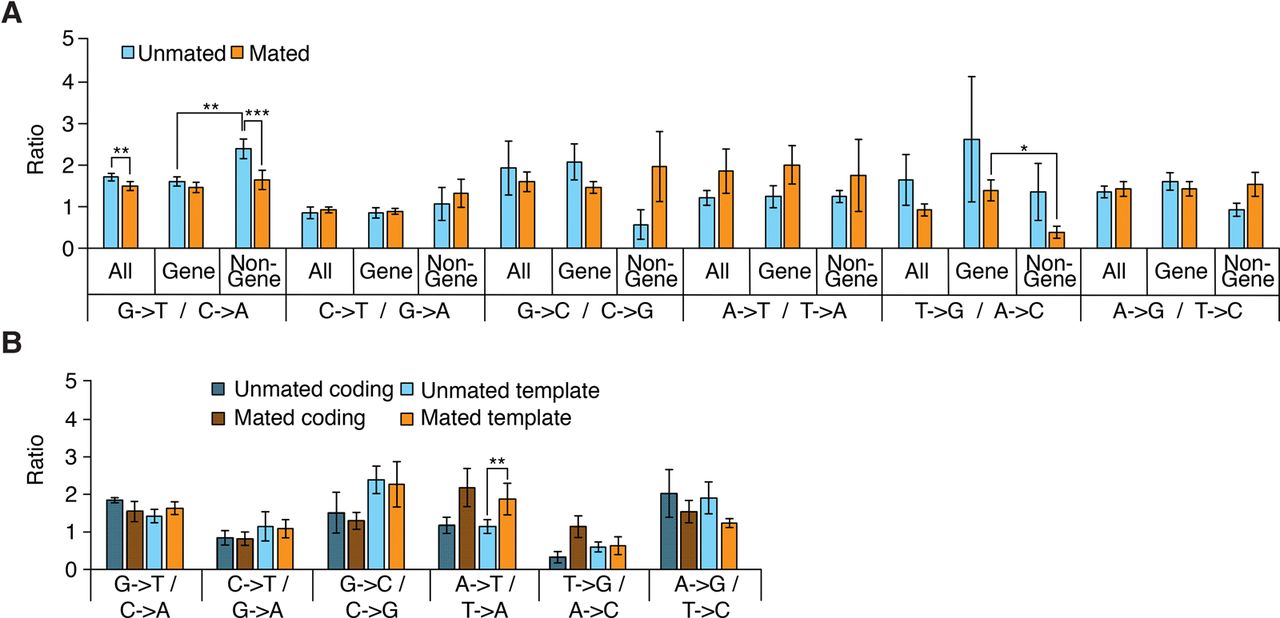 Duplex substitution disagreement ratios. (A,B) Ratios between each kind of duplex substitution disagreement and its reciprocal broken down by genome location (A) or coding or template strand type (B). Error bars and confidence intervals computed as in Figure 2.